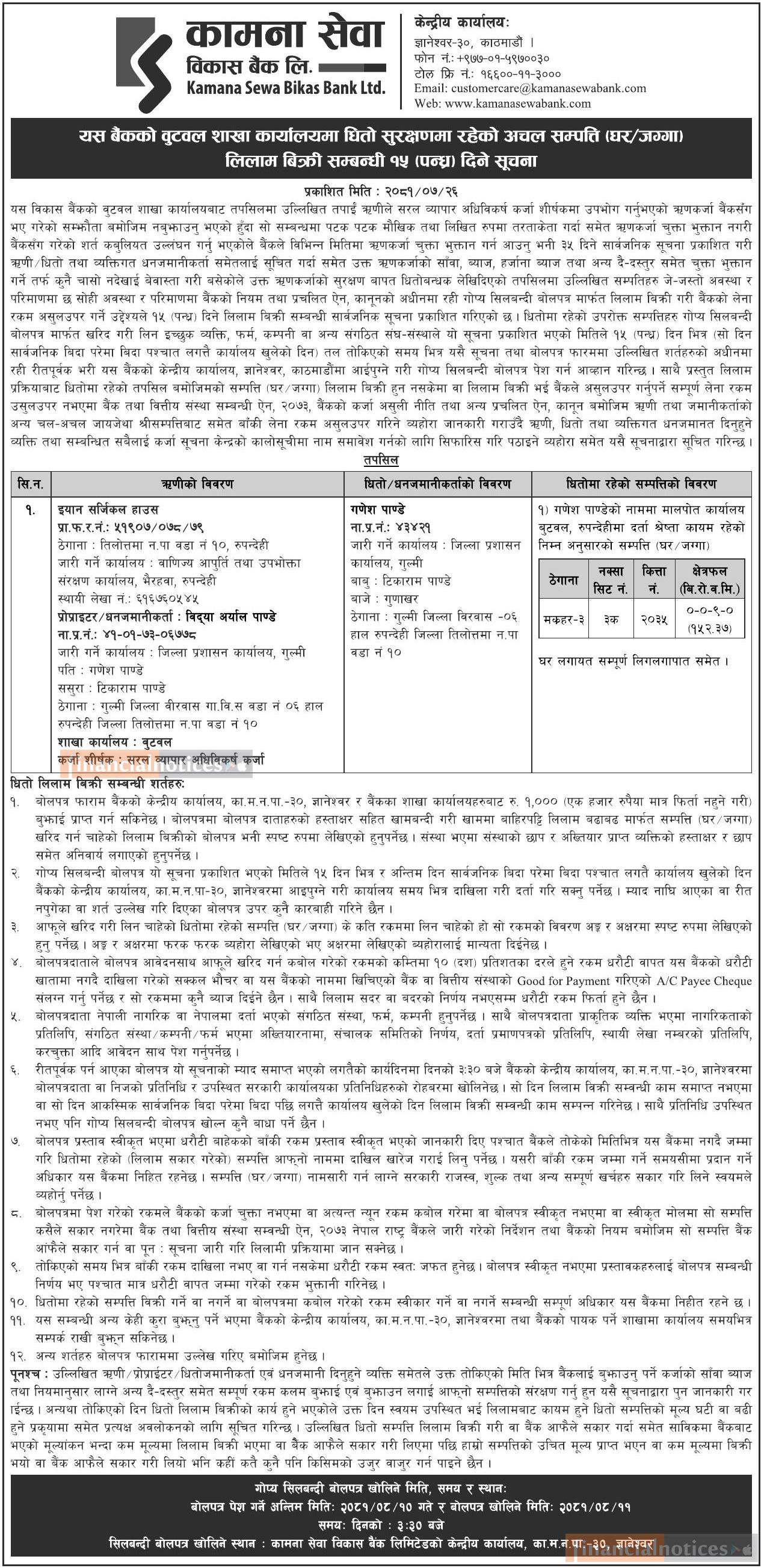बुटवल शाखा कार्यालयमा धितो सुरक्षणमा रहेको घर जग्गा लिलाम बिक्रीको सूचना