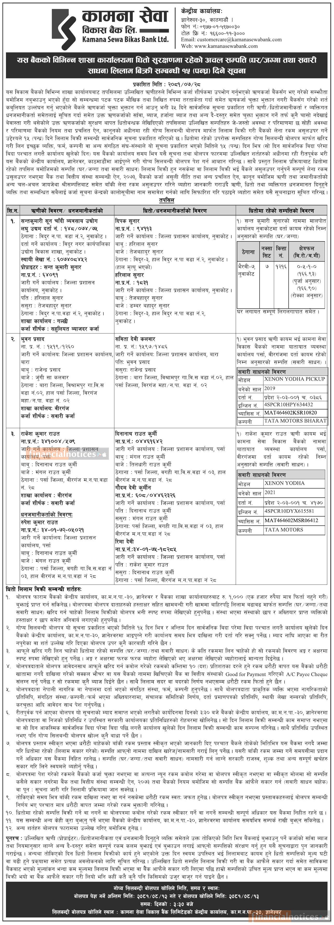 बैंकको विभिन्न शाखा कार्यालयमा धितो सुरक्षणमा रहेको घर जग्गा लिलाम बिक्रीको सूचना -