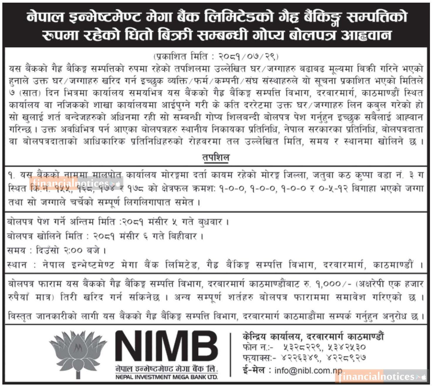 गैह्र बैंकिङ्ग सम्पत्तिको रुपमा रहेको धितो बिक्री बारे गोप्य शिलबन्दी बोलपत्र आव्हानको सूचना