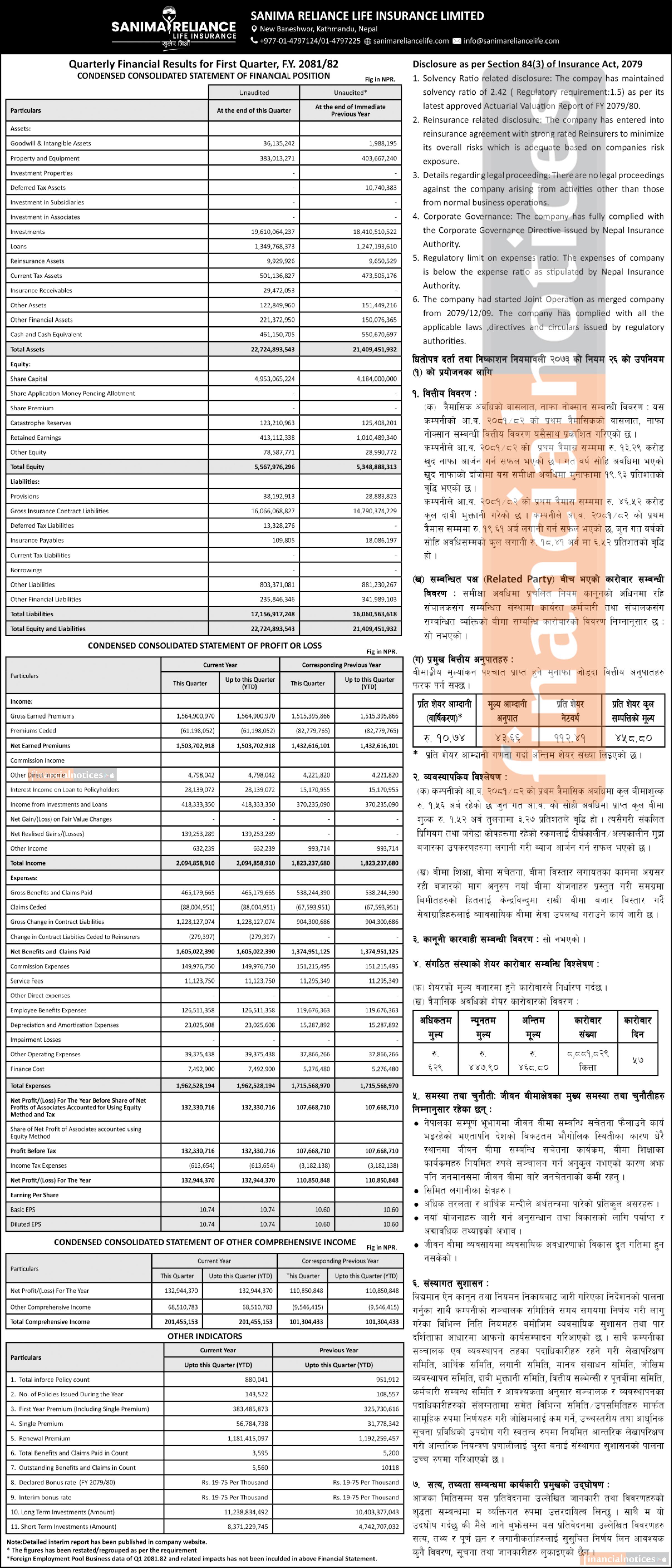 Sanima Reliance Life Insurance posted a net profit of Rs 132.94 million - Q1 Report