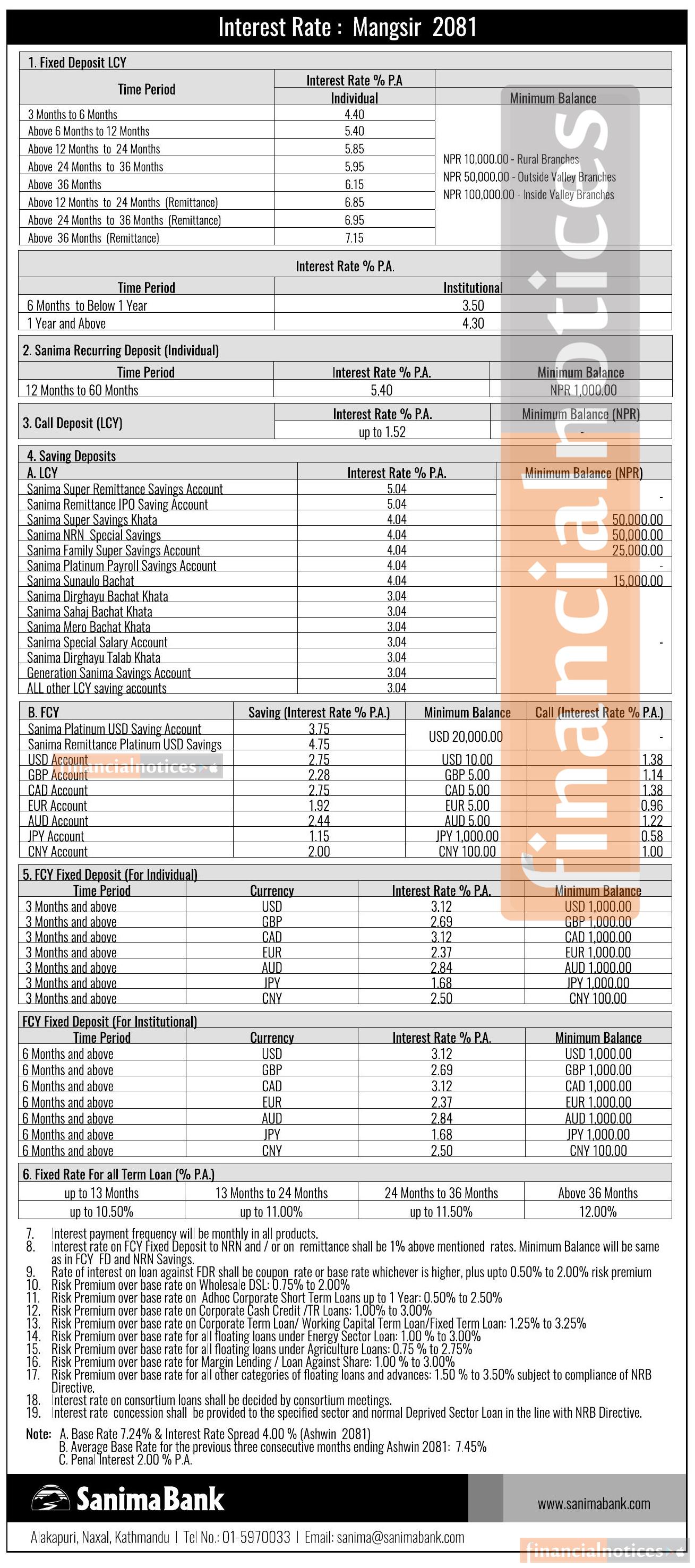 सानिमा बैंकको परिवर्तित ब्याजदर सार्वजनिक, कुन खातामा कति पुग्यो ?