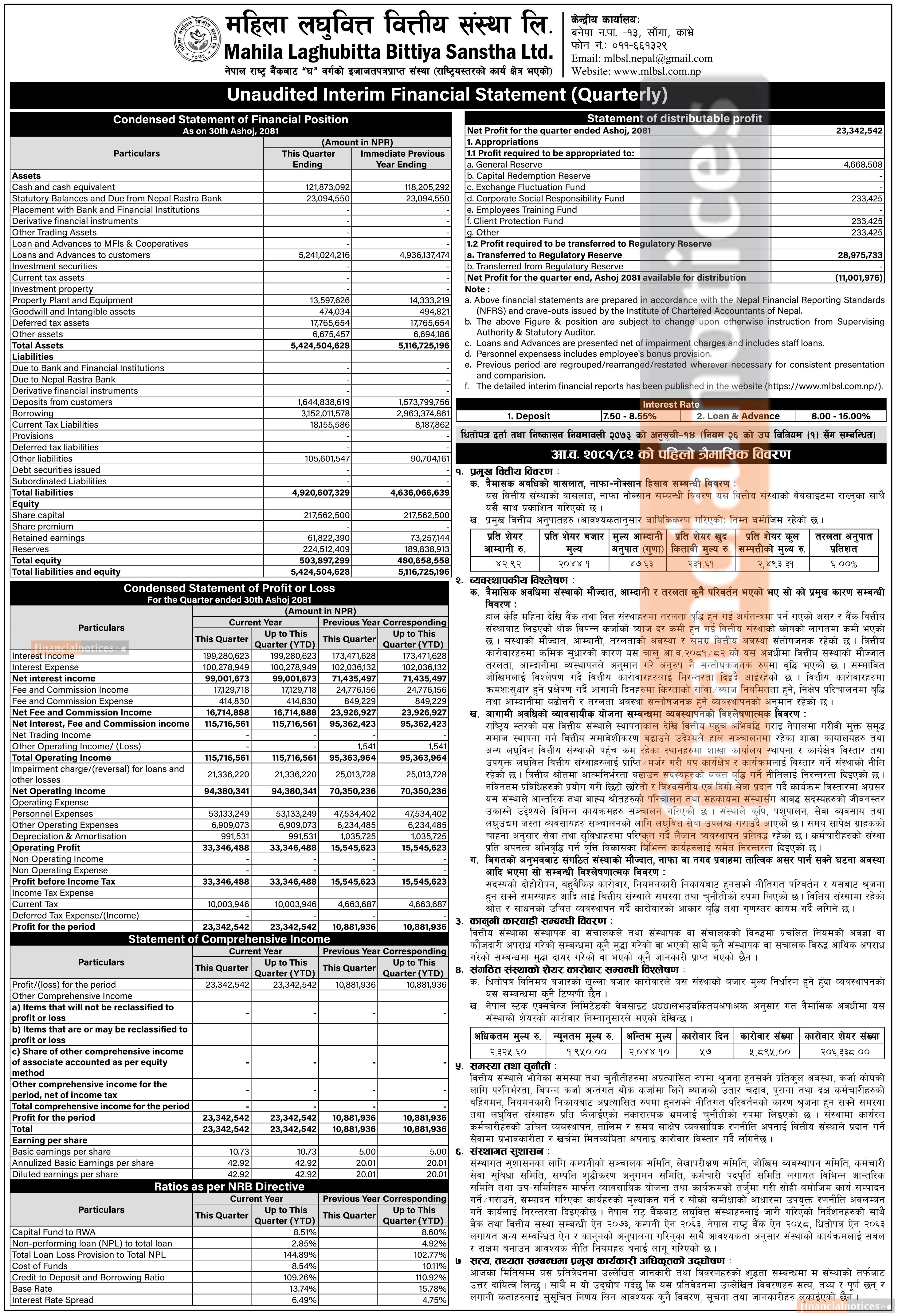 महिला लघुवित्तको पहिलो त्रैमासमा खुद नाफा २ करोड ३३ लाख ४२ हजार रुपैयाँ
