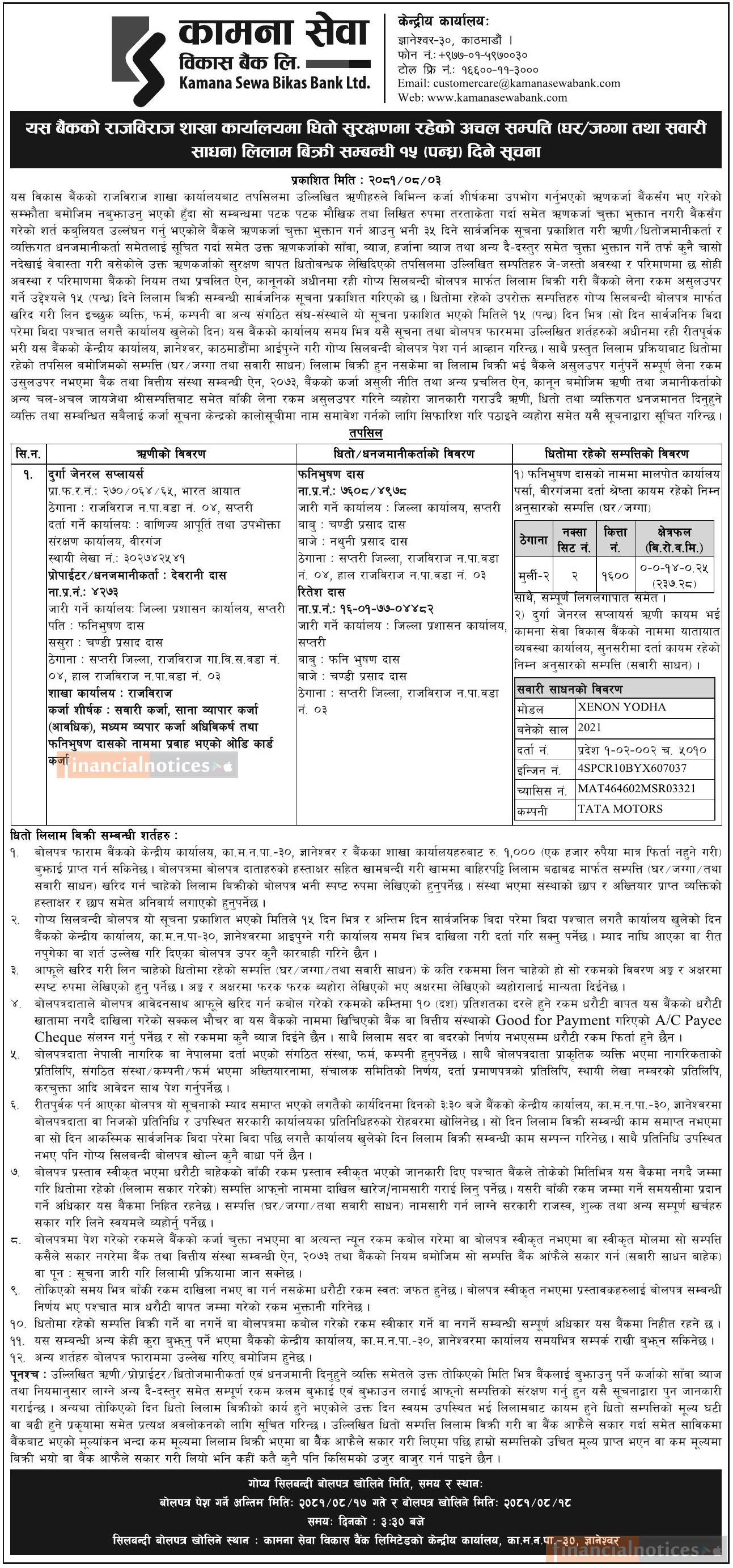 धितो सुरक्षणमा रहेको घर जग्गा तथा सवारी साधन लिलाम बिक्रीको सूचना