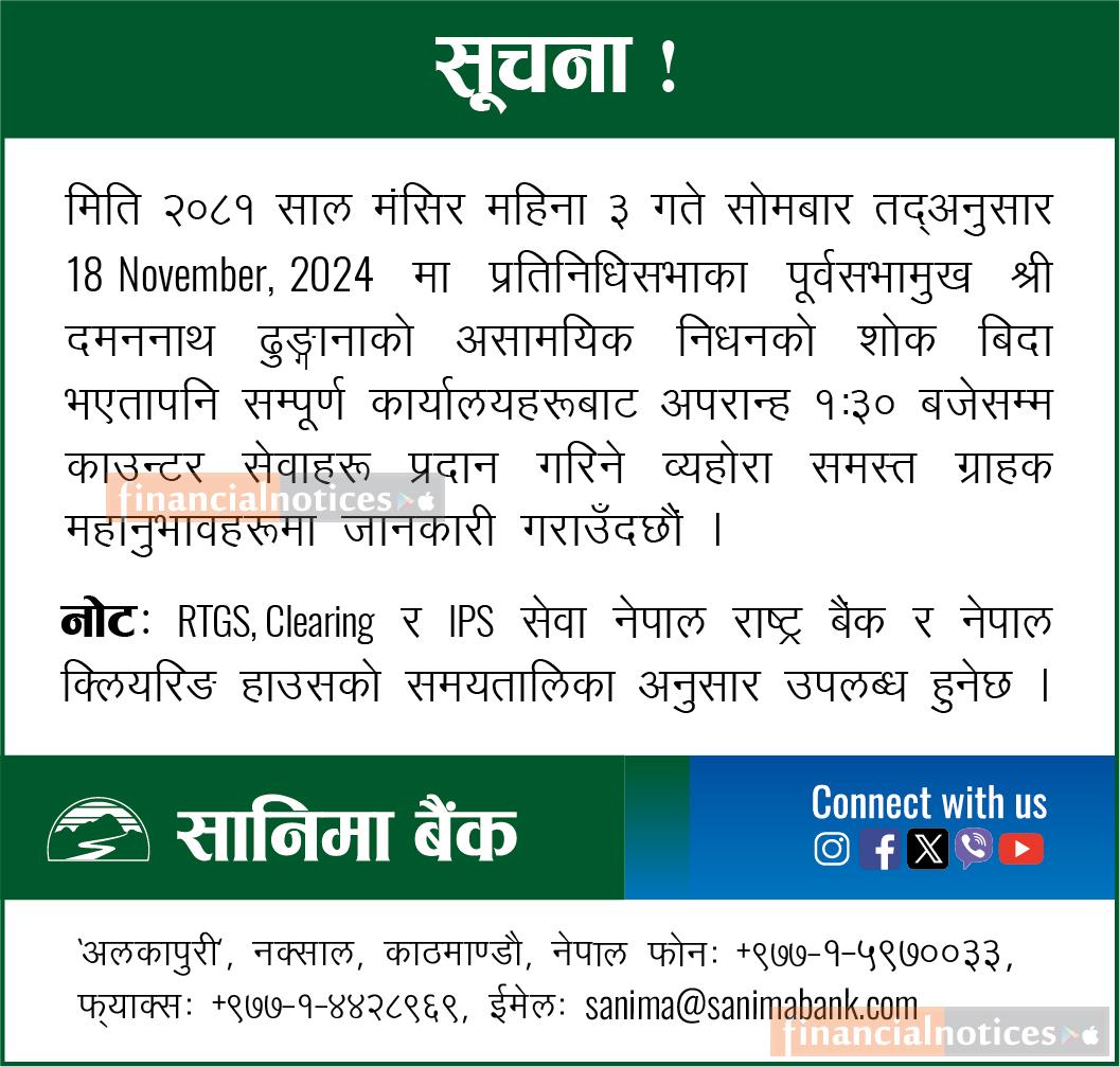 सानिमा बैंकको सूचनाको हक सम्बन्धी सूचना