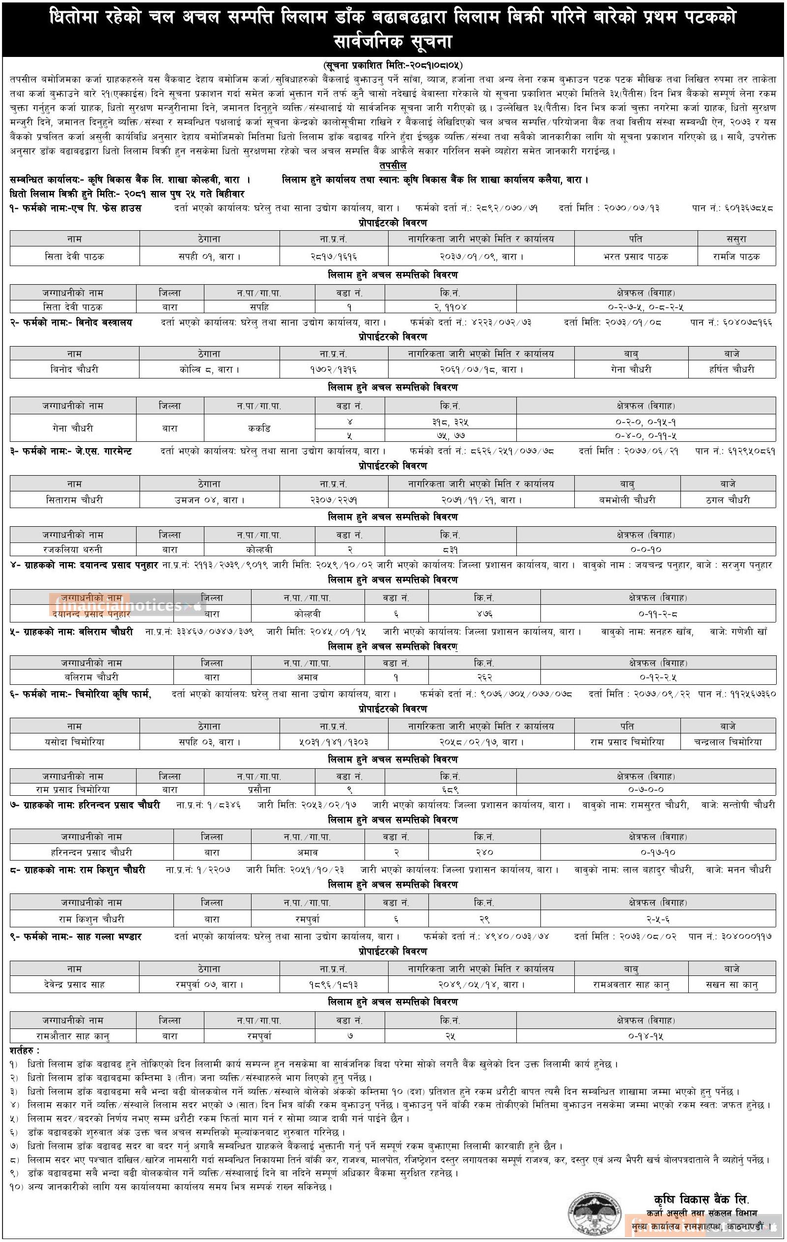 धितोमा रहेको चलअचल लिलाम डाँक बढाबढद्धारा लिलाम बिक्री गर्ने बारेको प्रथम पटकको सूचना