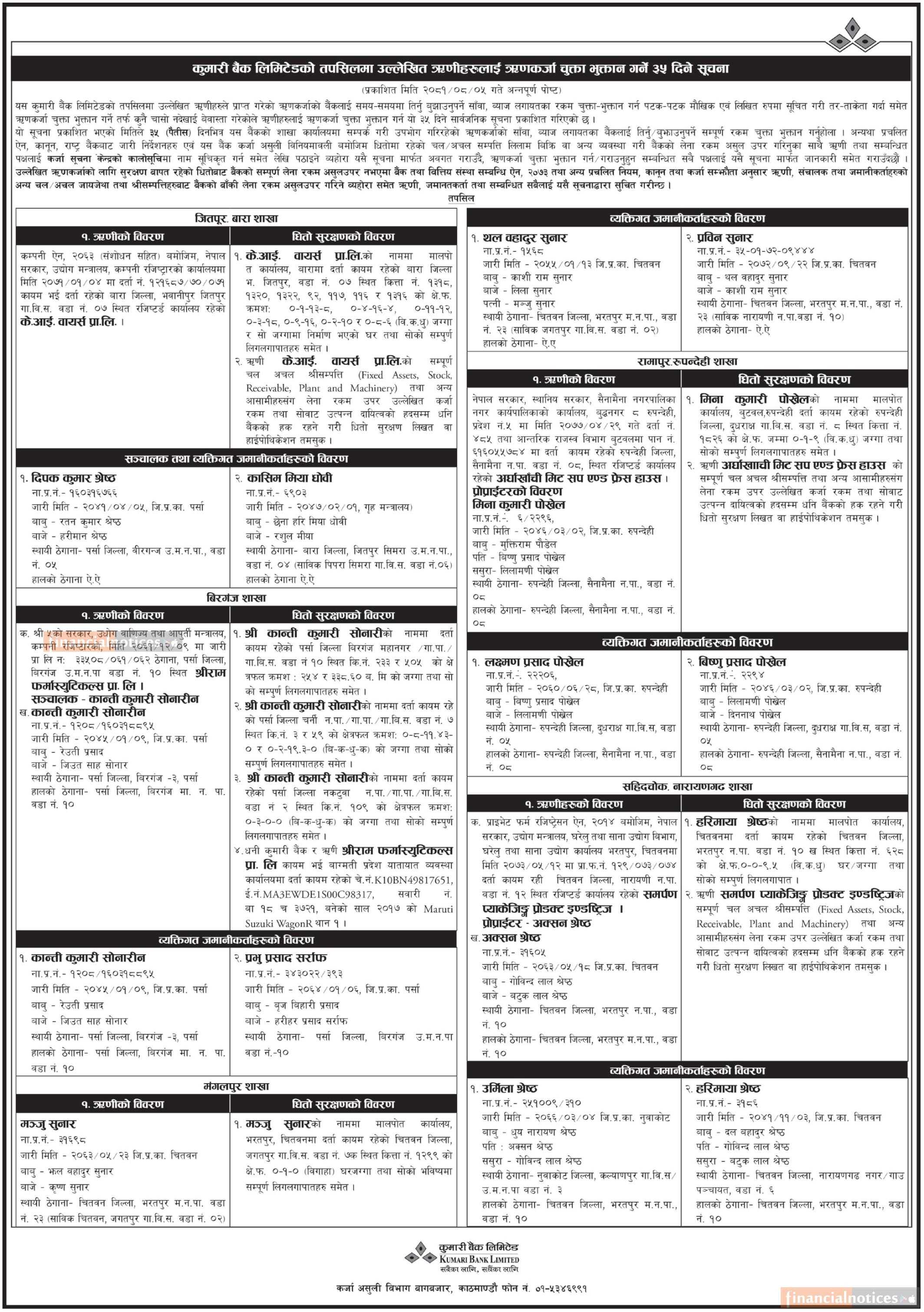 कुमारी बैंकका ऋणीहरुलाई ऋणकर्जा चुक्ता भुक्तान गर्नेबारे ३५ दिने सूचना