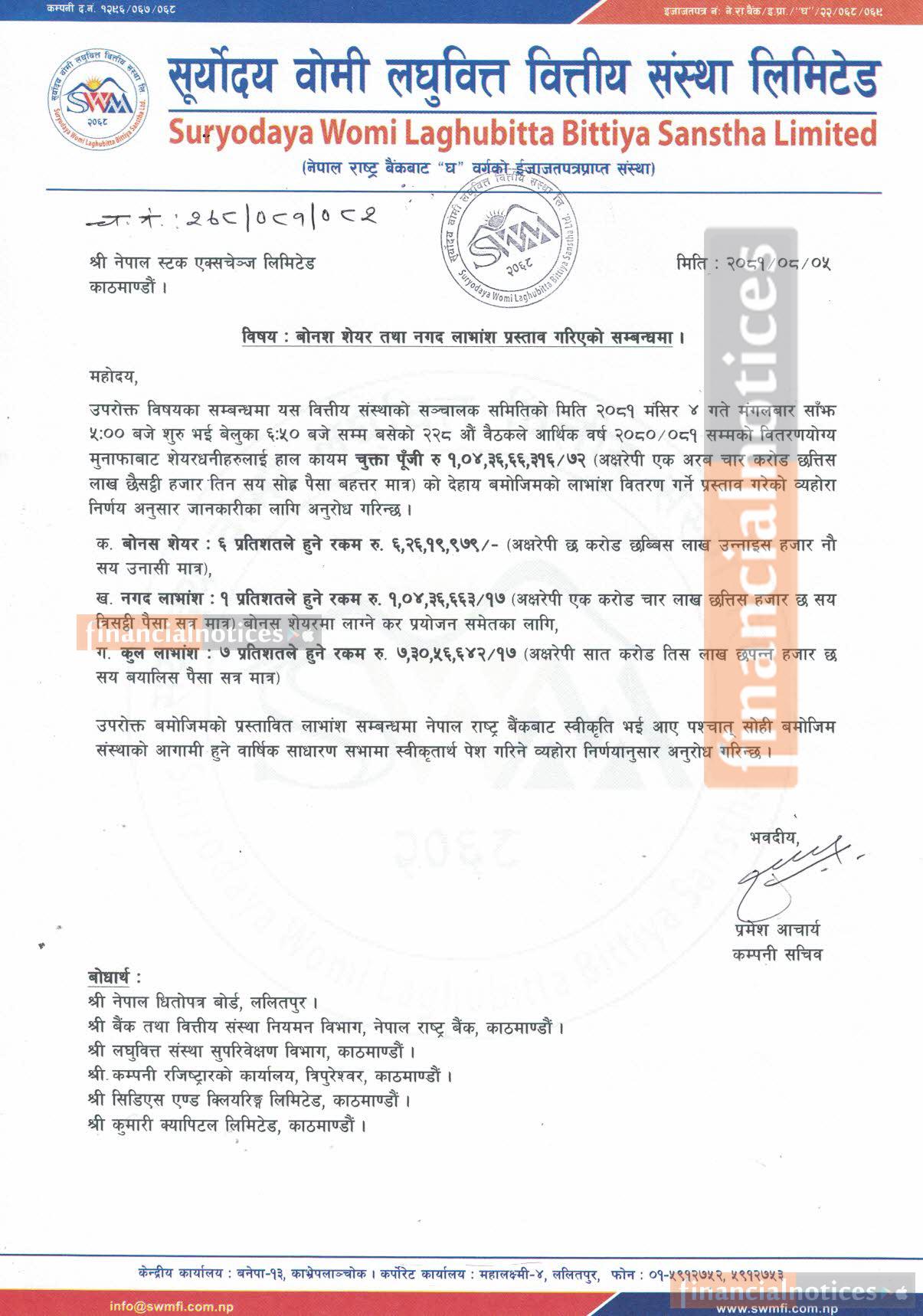 सूर्योदय वोमी लघुवित्तको लाभांश घोषणा सम्बन्धी सूचना
