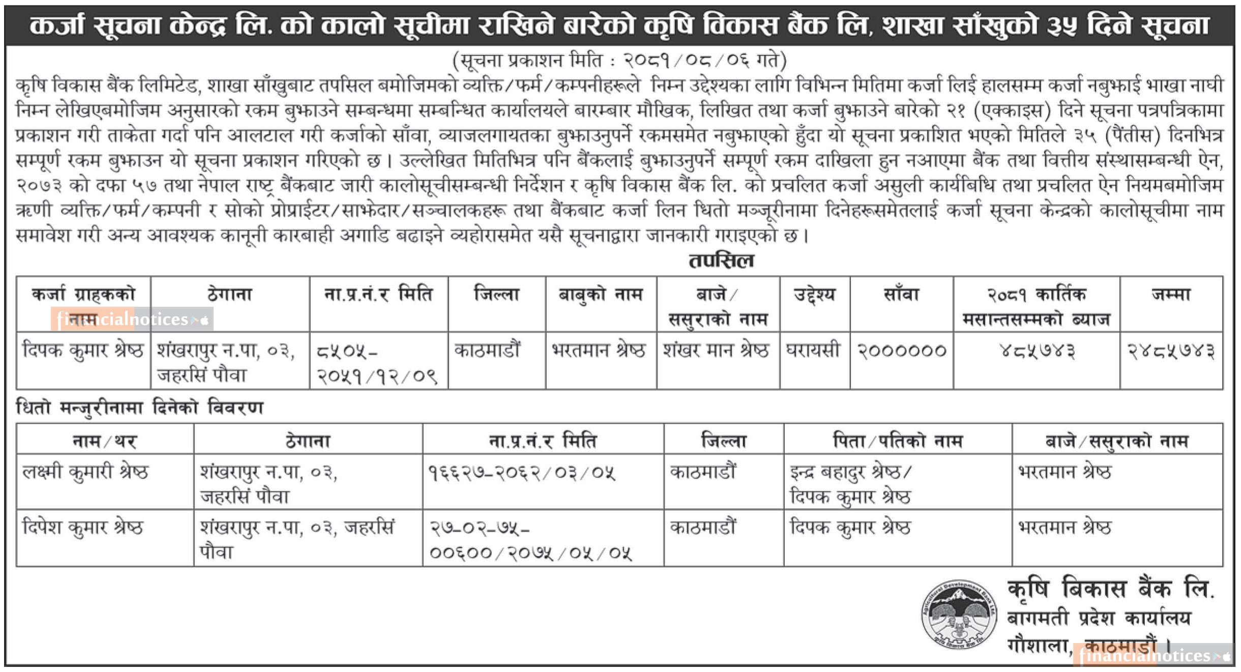 कृषि विकास बैंकको कर्जा सूचना केन्द्रको कालोसूचीमा राखिने बारे शाखा साँखुको सूचना