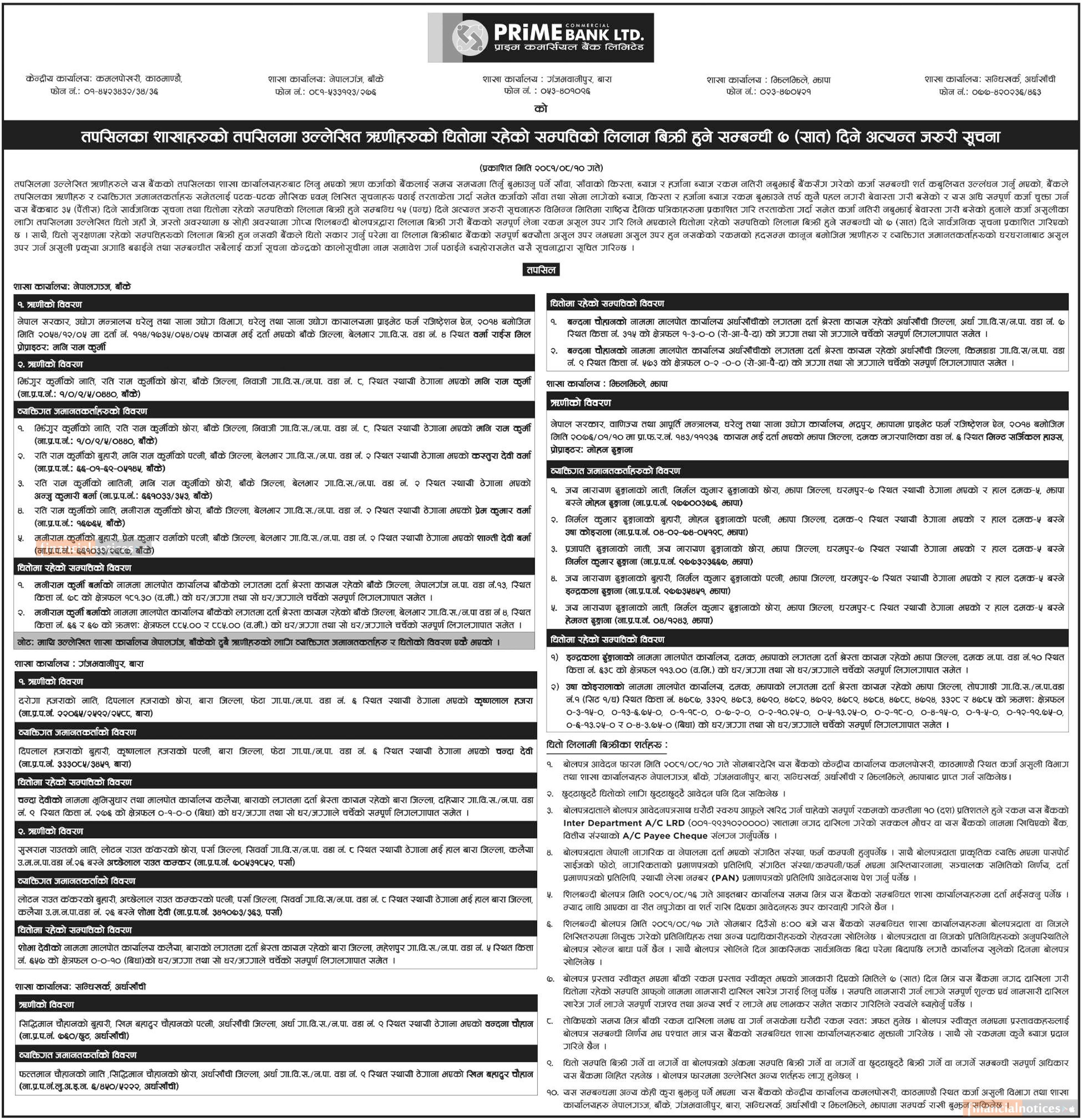 ऋणीहरुको धितोमा रहेको सम्पत्तिको लिलाम बिक्री हुने सम्बन्धी ७ दिने जरुरी सूचना