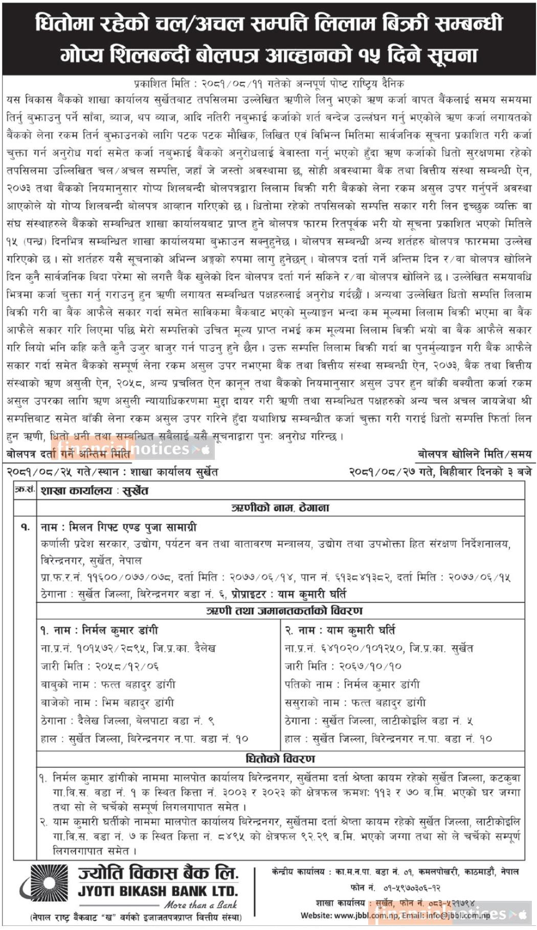 धितोमा रहेको चलअचल सम्पत्ति लिलाम बिक्री सम्बन्धी गोप्य शिलबन्दी बोलपत्र आव्हानको सूचना