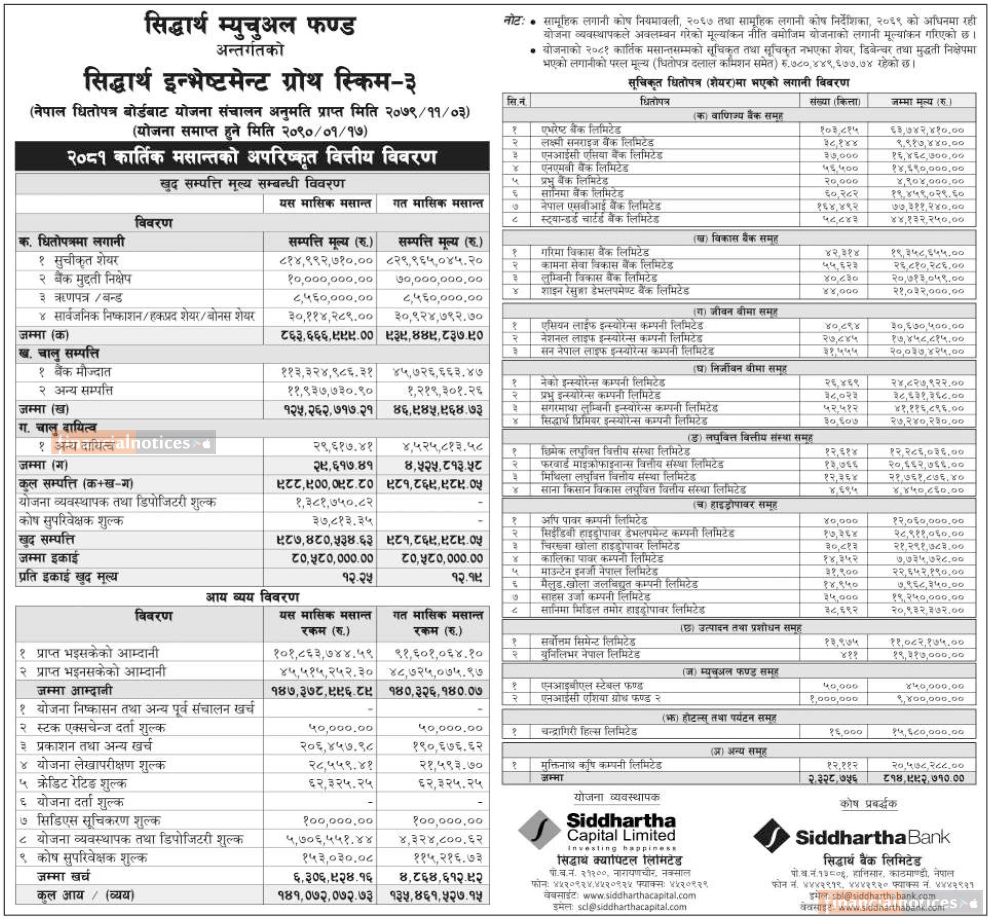 Siddhartha Capital has published “Siddhartha Investment Growth Scheme - 3” NAV till Kartik, 2081