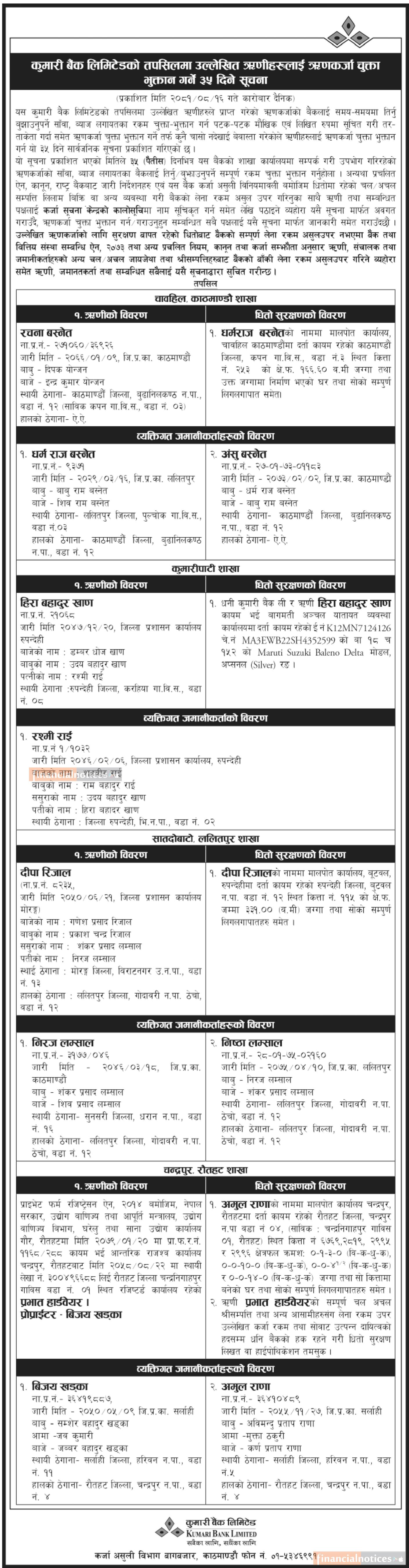 कुमारी बैंकका ऋणीहरुलाई ऋणकर्जा चुक्ता भुक्तान गर्नेबारे ३५ दिने सूचना