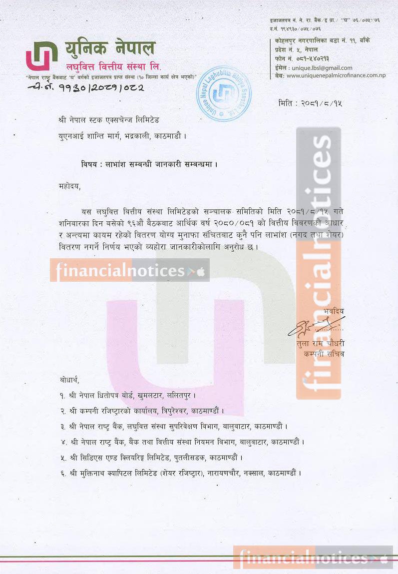 युनिक नेपाल लघुवित्तले लाभांस वितरण नगर्ने सम्बन्धी सूचना