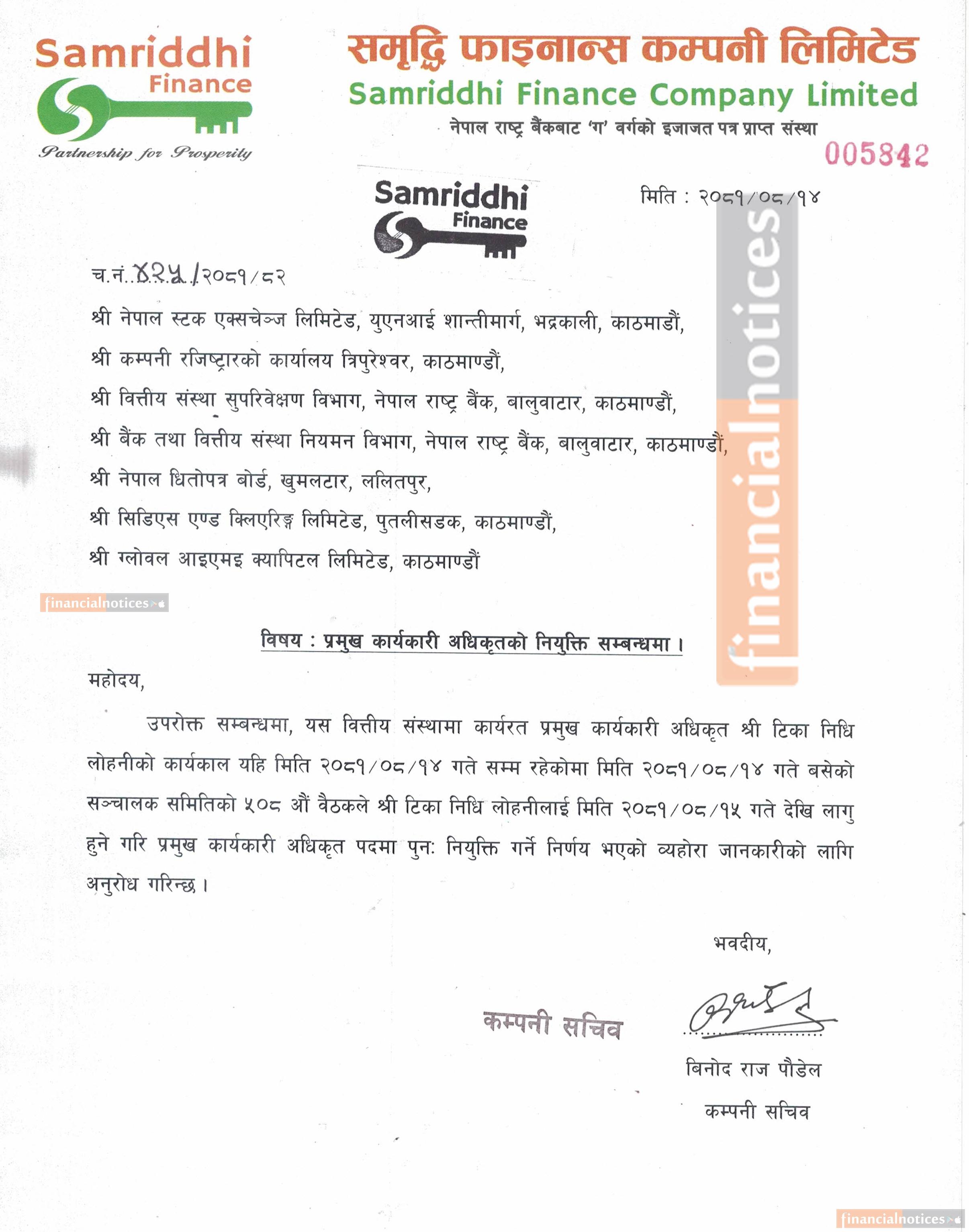 समृद्धि फाइनान्समा सिईओ नियुक्ति सम्बन्धी सूचना