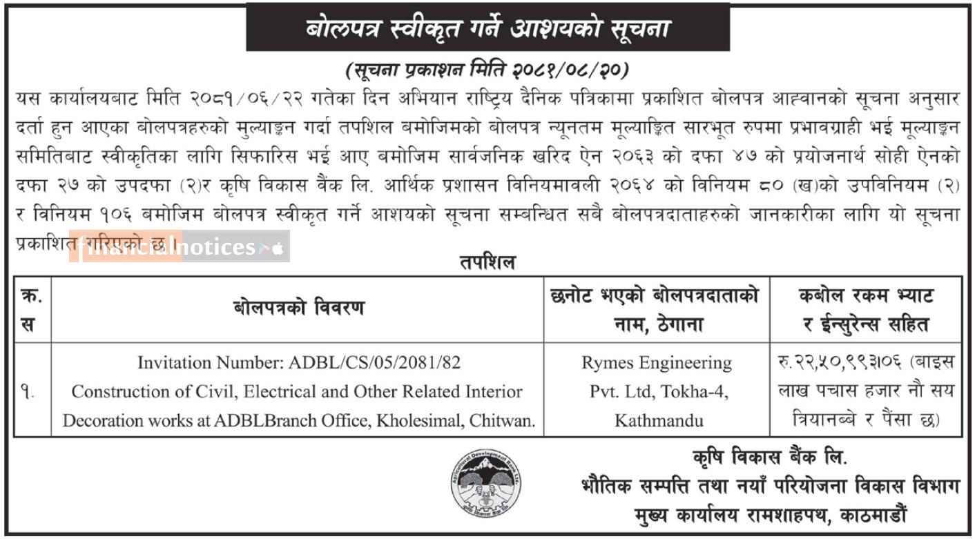 बोलपत्र स्वीकृत गर्ने आशयको सूचना