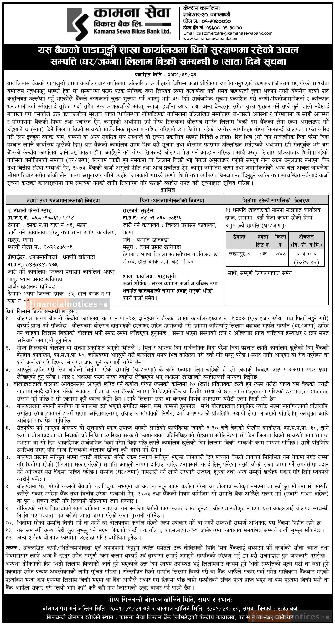 धितो सुरक्षणमा रहेको घर जग्गा लिलाम बिक्रीको लागि ७ दिने सूचना