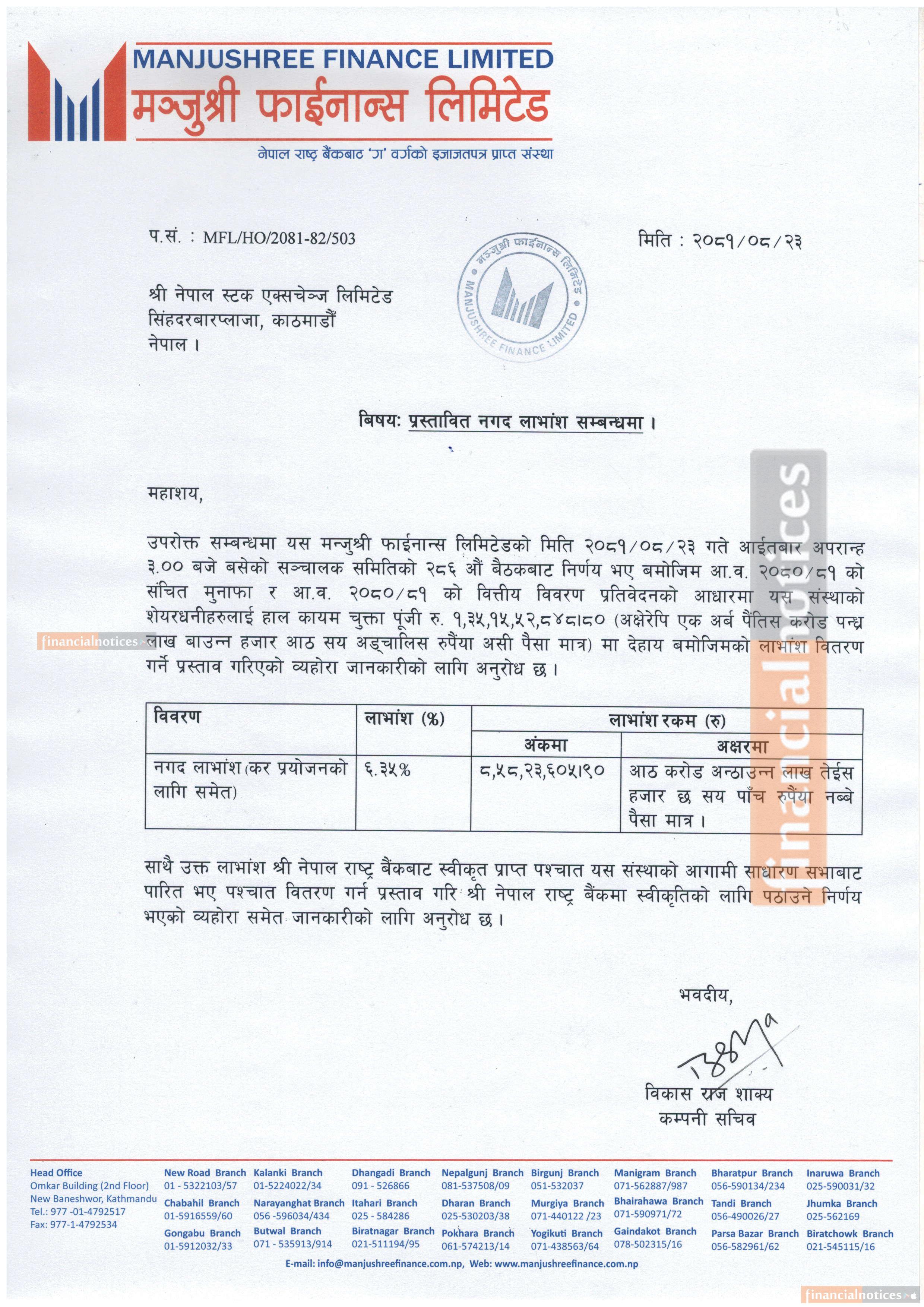 मञ्जुश्री फाइनान्सको लाभांश घोषणा सम्बन्धी सूचना