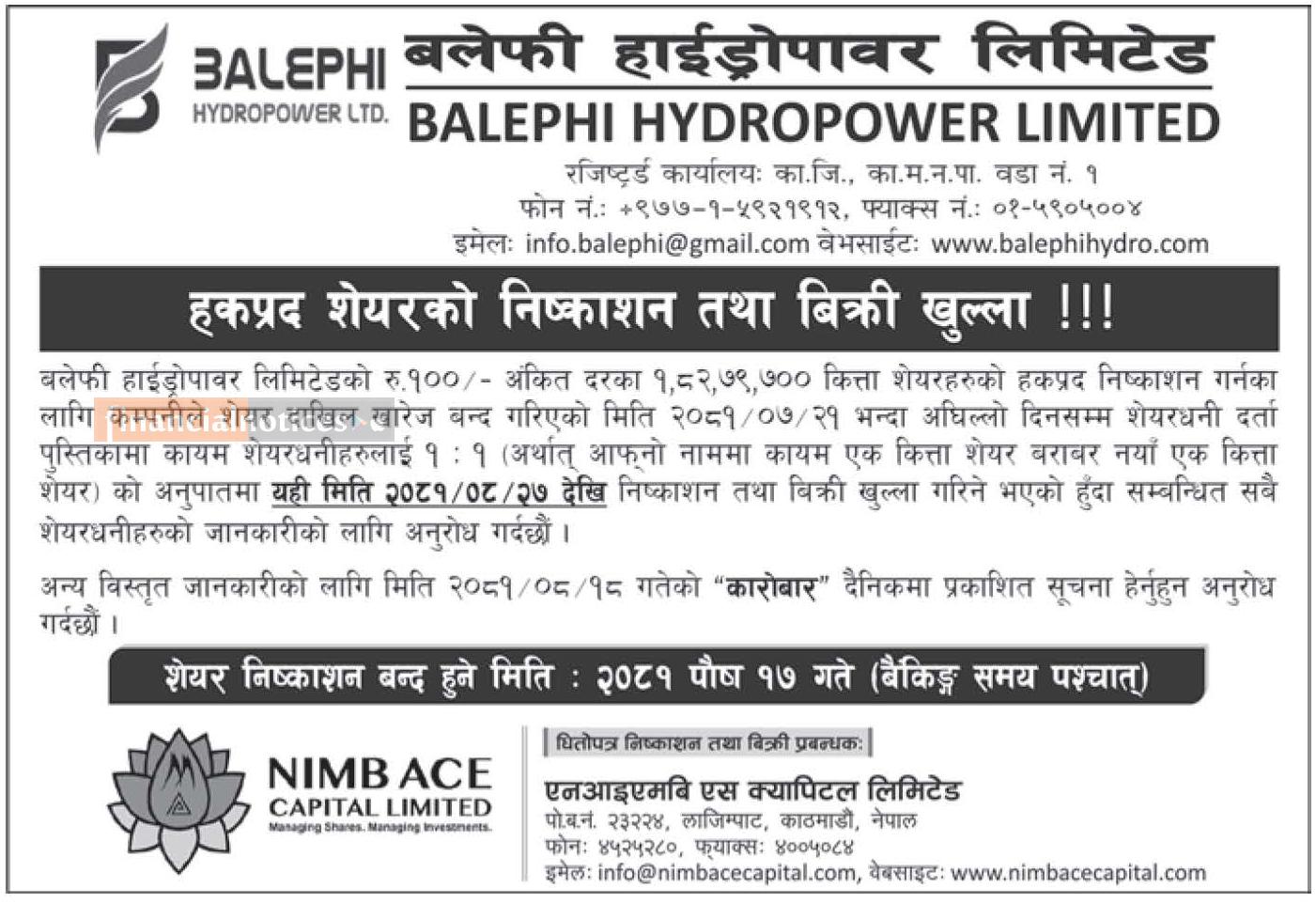 बलेफी हाइड्रोपावरको हकप्रद शेयर निष्काशन सम्बन्धी सूचना