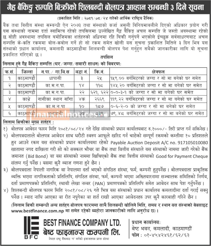 गैह्र बैंकिङ्ग सम्पत्ति बिक्रीको शिलबन्दी बोलपत्र आव्हान सम्बन्धी ३ दिने सूचना