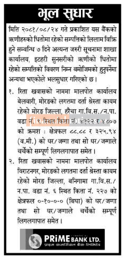 बैंकको भुलसुधार सम्बन्धी सूचना -