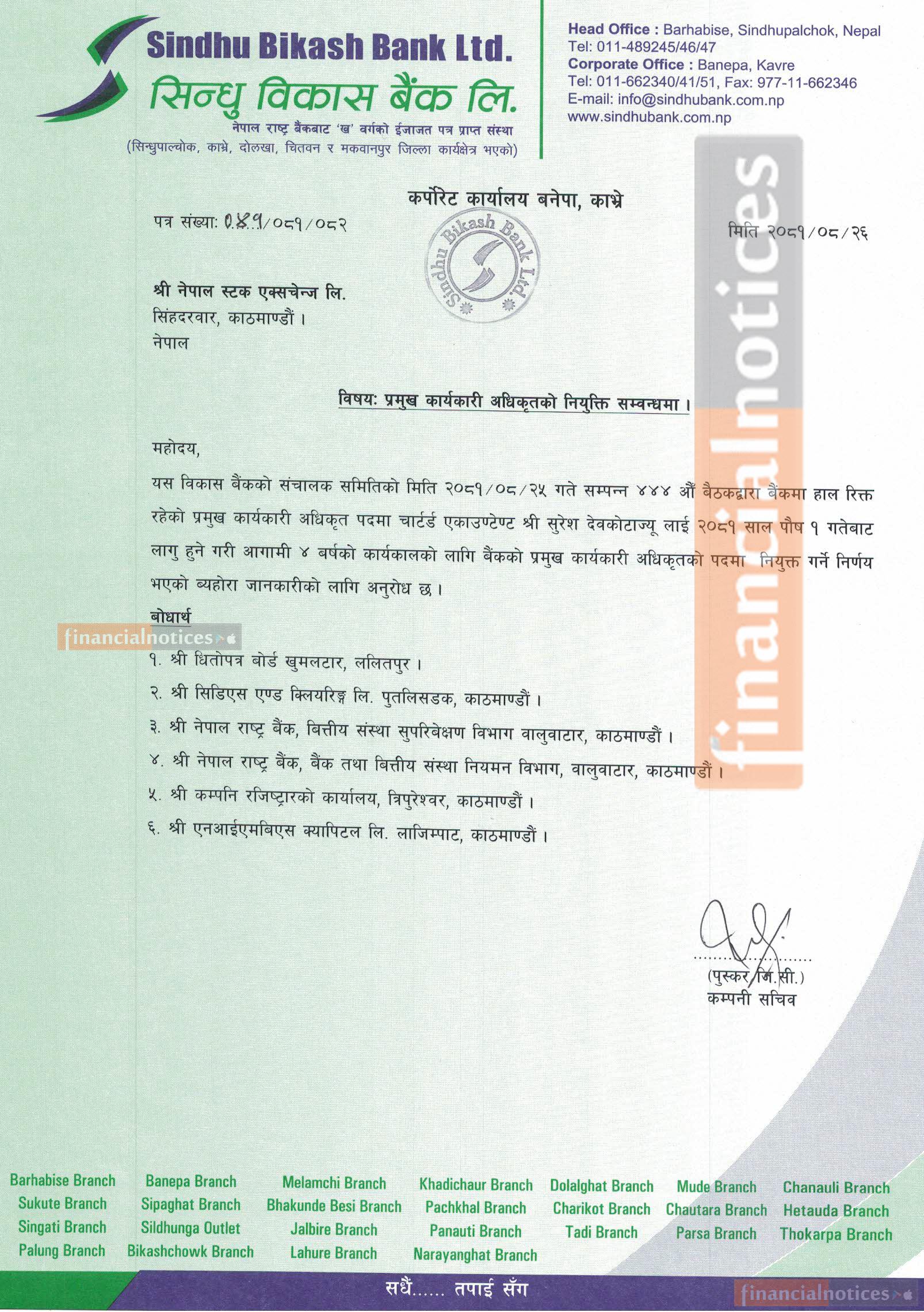 सिन्धु विकास बैंकको सिईओमा सुरेश देवकोटा नियुक्ति सम्बन्धी सूचना
