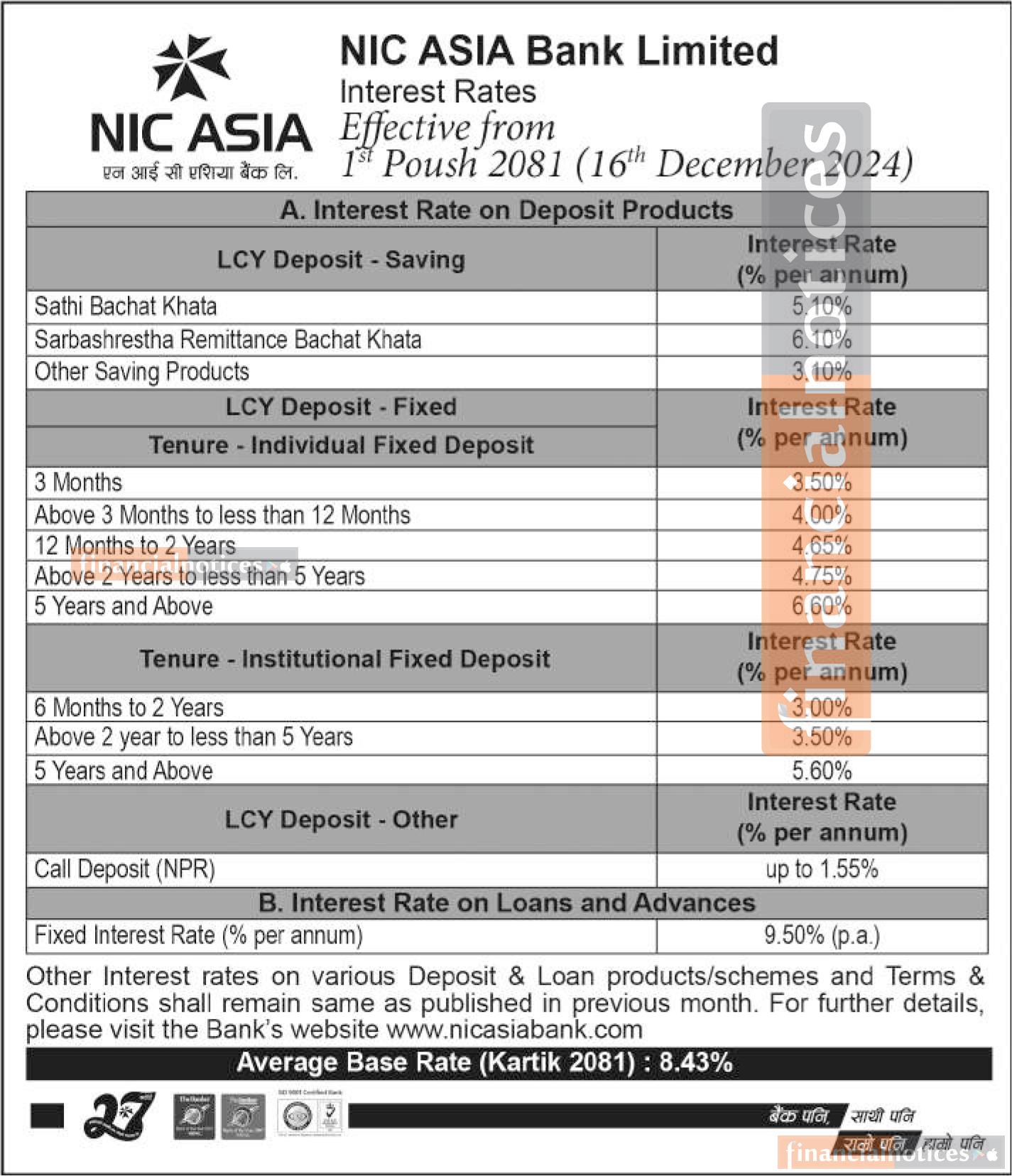 एनआइसी एशिया बैंकको ब्याजदर सूचना : पौषबाट लागू - Interest Rate -