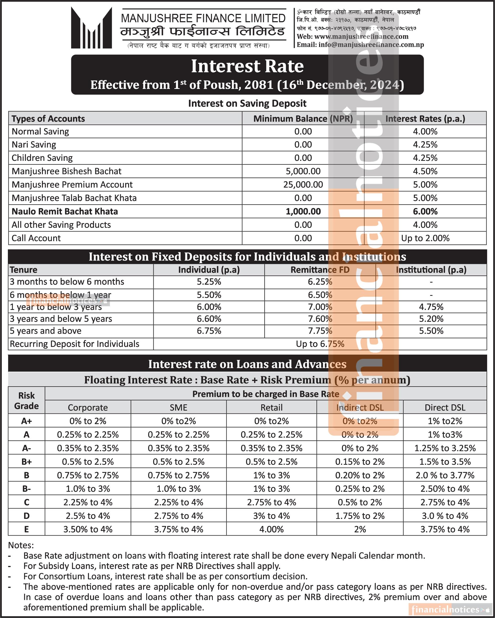 मन्जुश्री फाइनान्सको ब्याजदर परिवर्तन सम्बन्धी सूचना - Interest Rates -