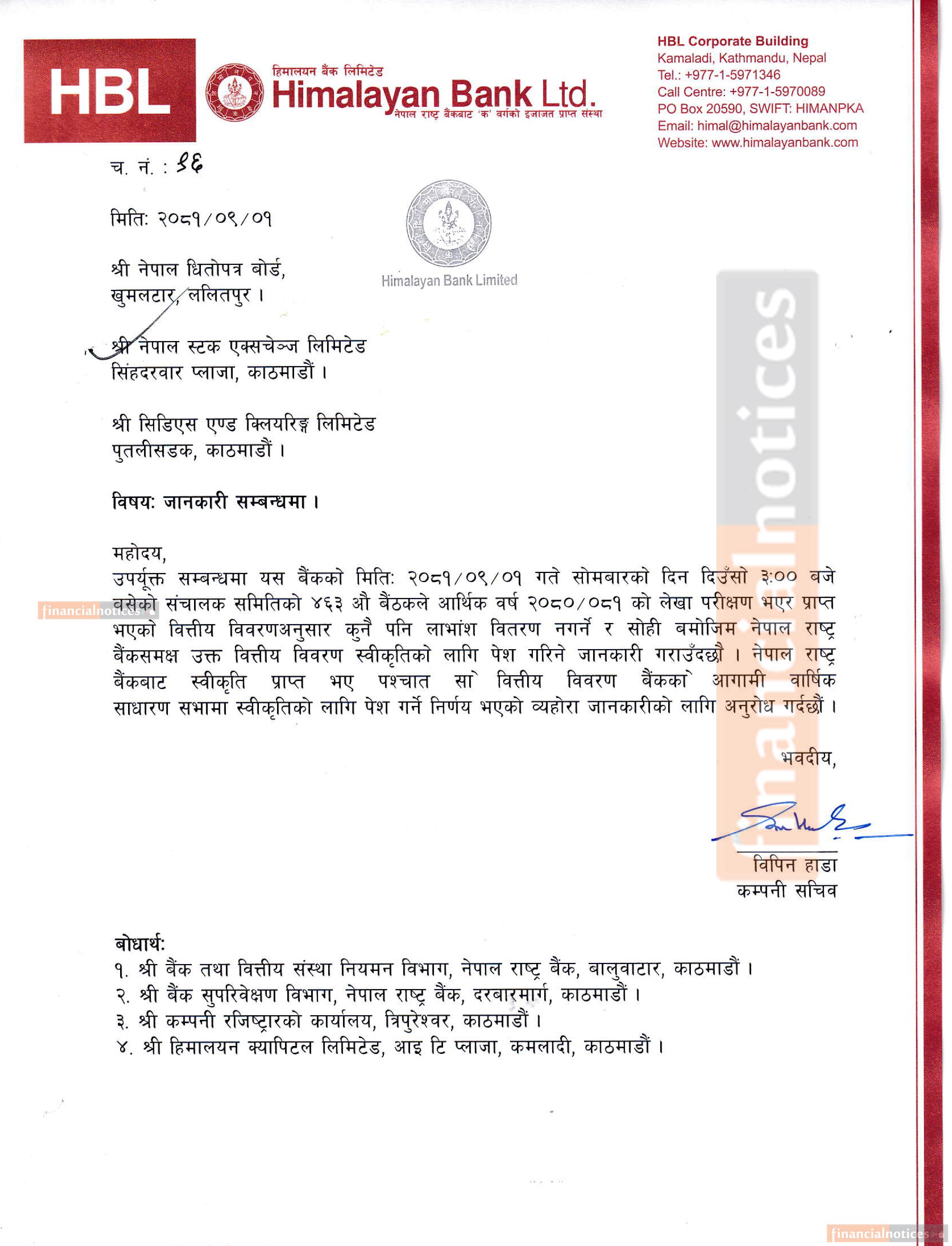 हिमालयन बैंकले यस वर्ष शेयरधनीहरुलाई लाभांश वितरण नगर्ने सम्बन्धी सूचना