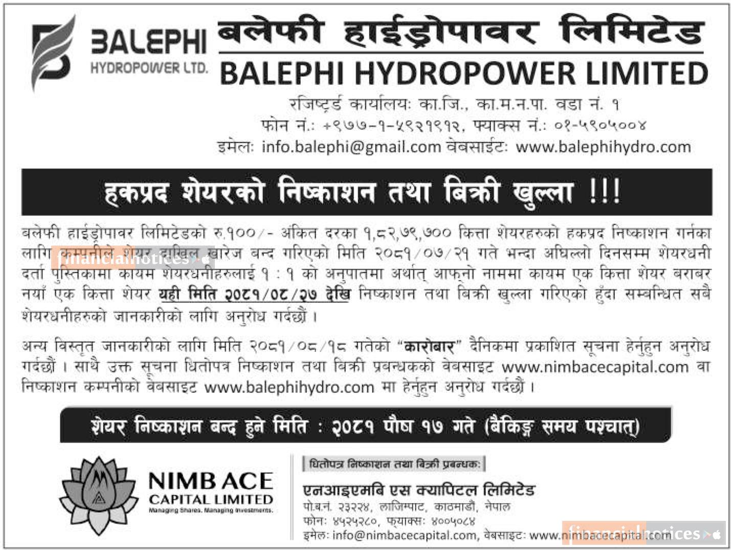 हकप्रद शेयरको निष्काशन तथा बिक्री खुल्ला सम्बन्धी सूचना