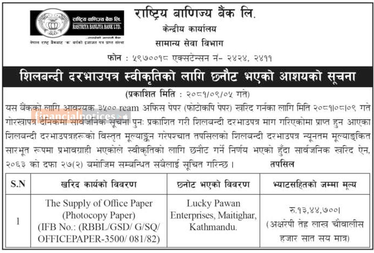 शिलबन्दी दरभाउपत्र स्वीकृतिको लागि छनौट भएको आशयको सूचना