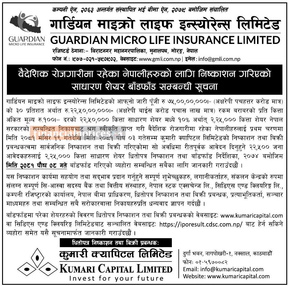 गार्डियन माइक्रो लाइफ इन्सुरेन्सको आइपीओ बाँडफाँड सम्बन्धी सूचना