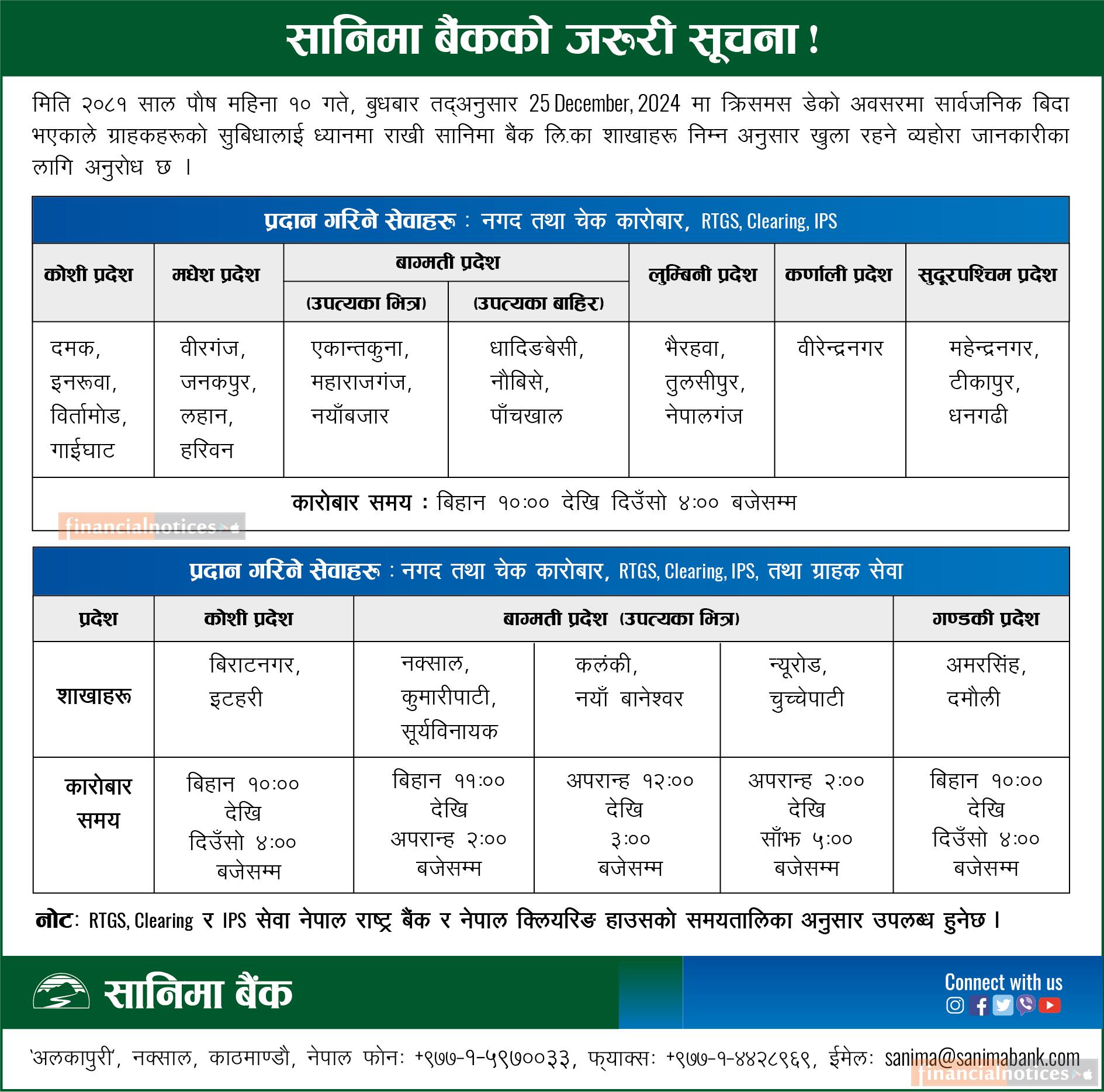 सानिमा बैंकको शाखा खुल्ला रहने बारे जरुरी सूचना