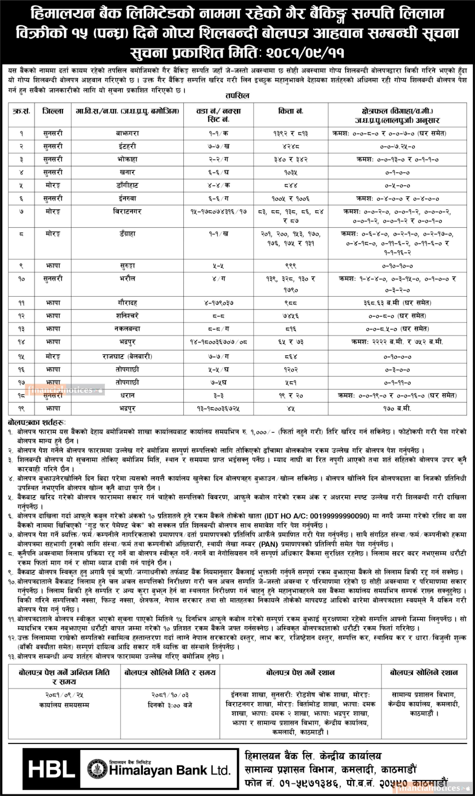 गैह्र बैंकिङ्ग सम्पत्ति लिलाम बिक्रीको १५ दिने गोप्य शिलबन्दी बोलपत्र आव्हानको सूचना