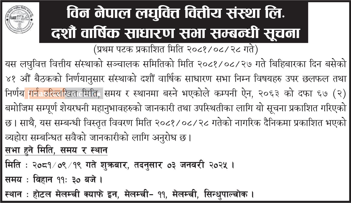दसौँ वार्षिक साधारण सभा सम्बन्धी सूचना