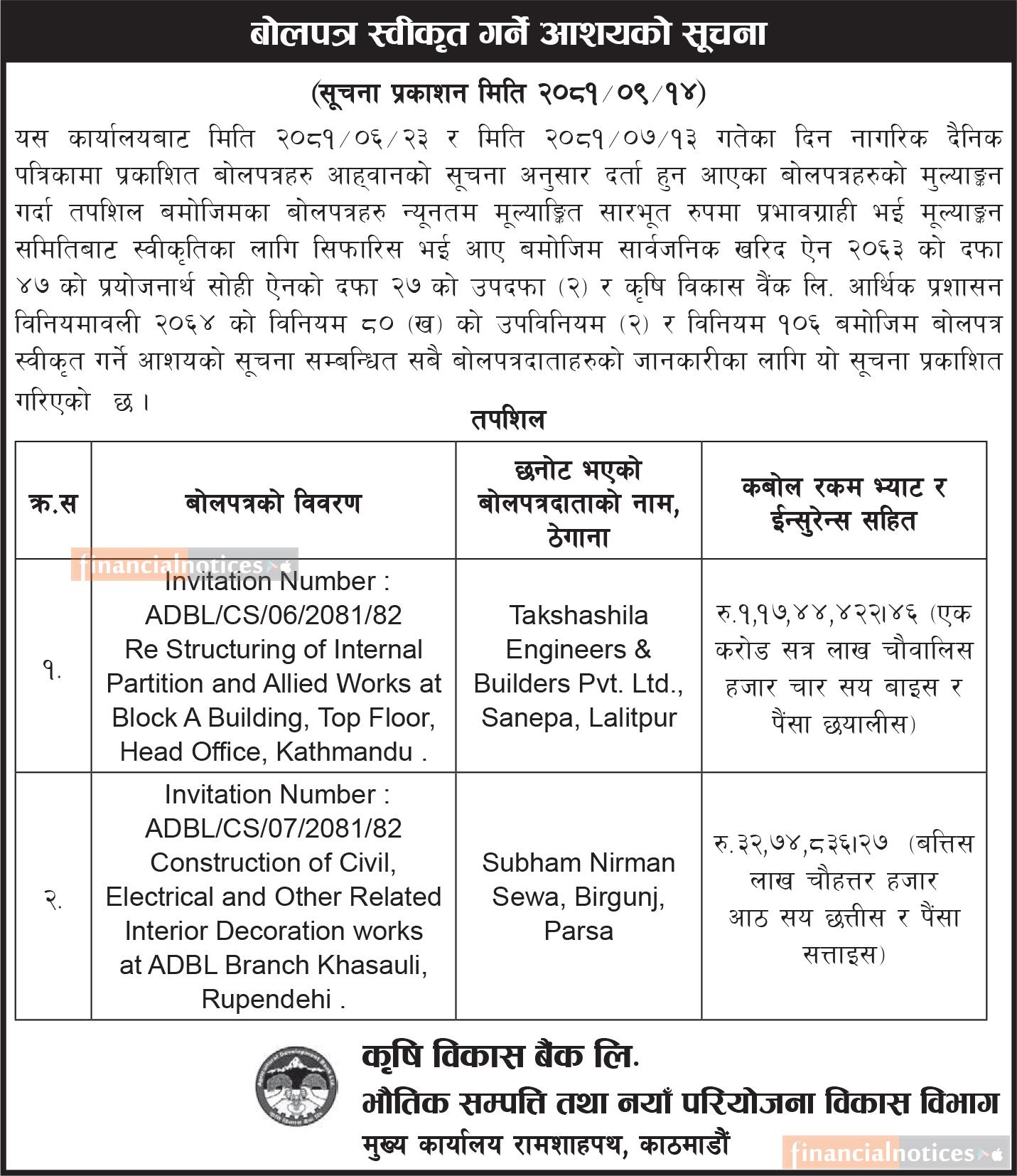 बोलपत्र स्वीकृत गर्ने आशयको सूचना