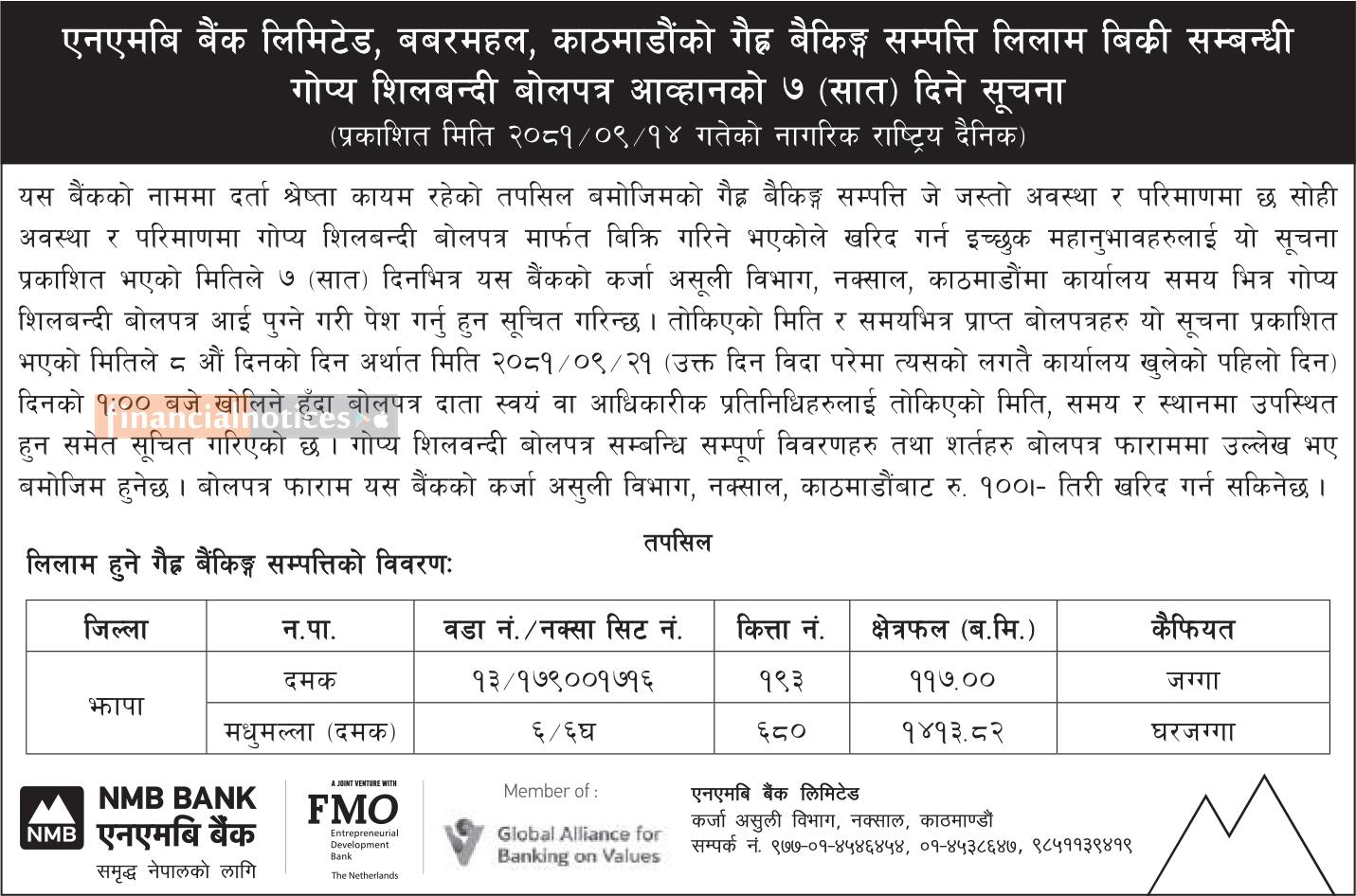 गैह्र बैंकिङ्ग सम्पत्ति लिलाम बिक्री सम्बन्धी गोप्य शिलबन्दी बोलपत्र आव्हानको सूचना