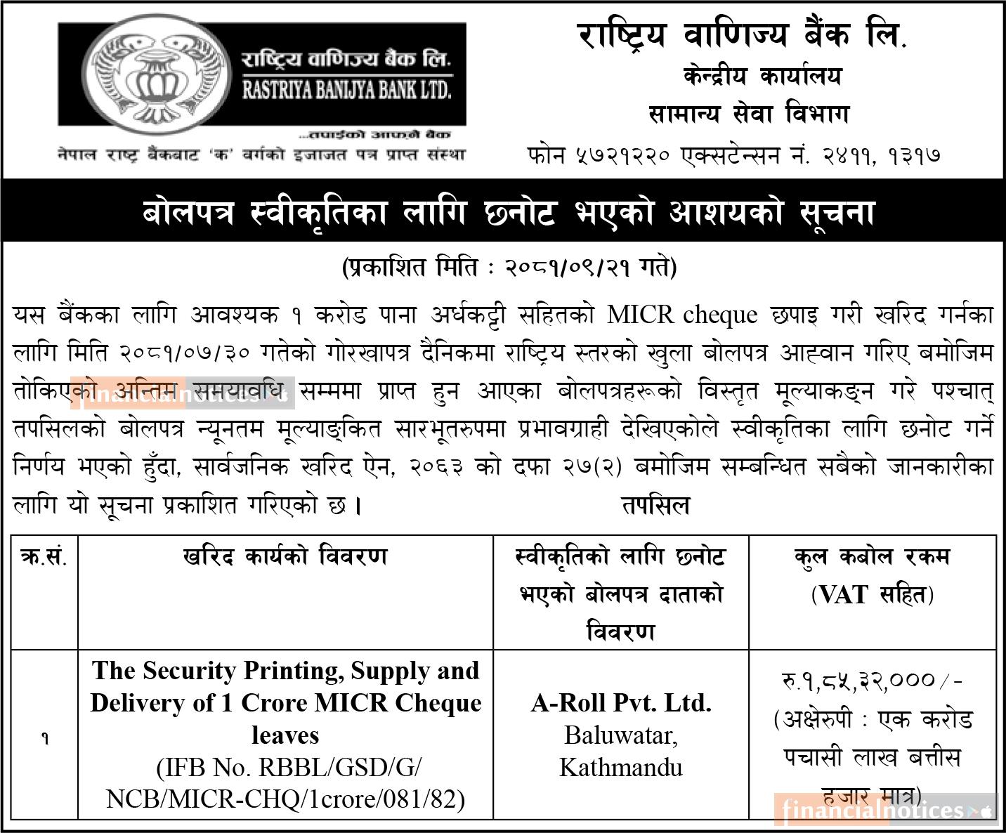 बोलपत्र स्वीकृतिका लागि छनोट भएको आशयको सूचना