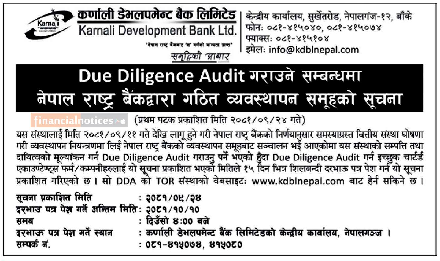 राष्ट्र बैंकको नियन्त्रणमा रहेको कर्णाली डेभलपमेन्ट बैंकको सम्पत्ति र दायित्व मूल्यांकन (डीडीए) प्रक्रिया सुरु हुने भएको छ। राष्ट्र बैंकले गठन गरेको व्यवस्थापन समूहले बुधबार सूचना जारी गर्दै इच्छुक चार्टर्ड एकाउन्टेन्ट फर्म र कम्पनीलाई १५ दिन भित्र दरभाउ पेस गर्न आह्वान गरेको हो। दरभाउ पेस गर्न १० माघभित्र नेपालगञ्जस्थित बैंकको केन्द्रीय कार्यालयमा पुग्नुपर्नेछ। केही समय अघि कर्णाली डेभलपमेन्ट बैंकलाई समस्याग्रस्त घोषणा गर्दै राष्ट्र बैंकले व्यवस्थापन नियन्त्रणमा लिएको थियाे। बैंकले पुस २३ गतेदेखि २६ गतेसम्मका लागि निक्षेप भुक्तानी रोक्ने निर्णय गरेको जानकारी दिएको छ।