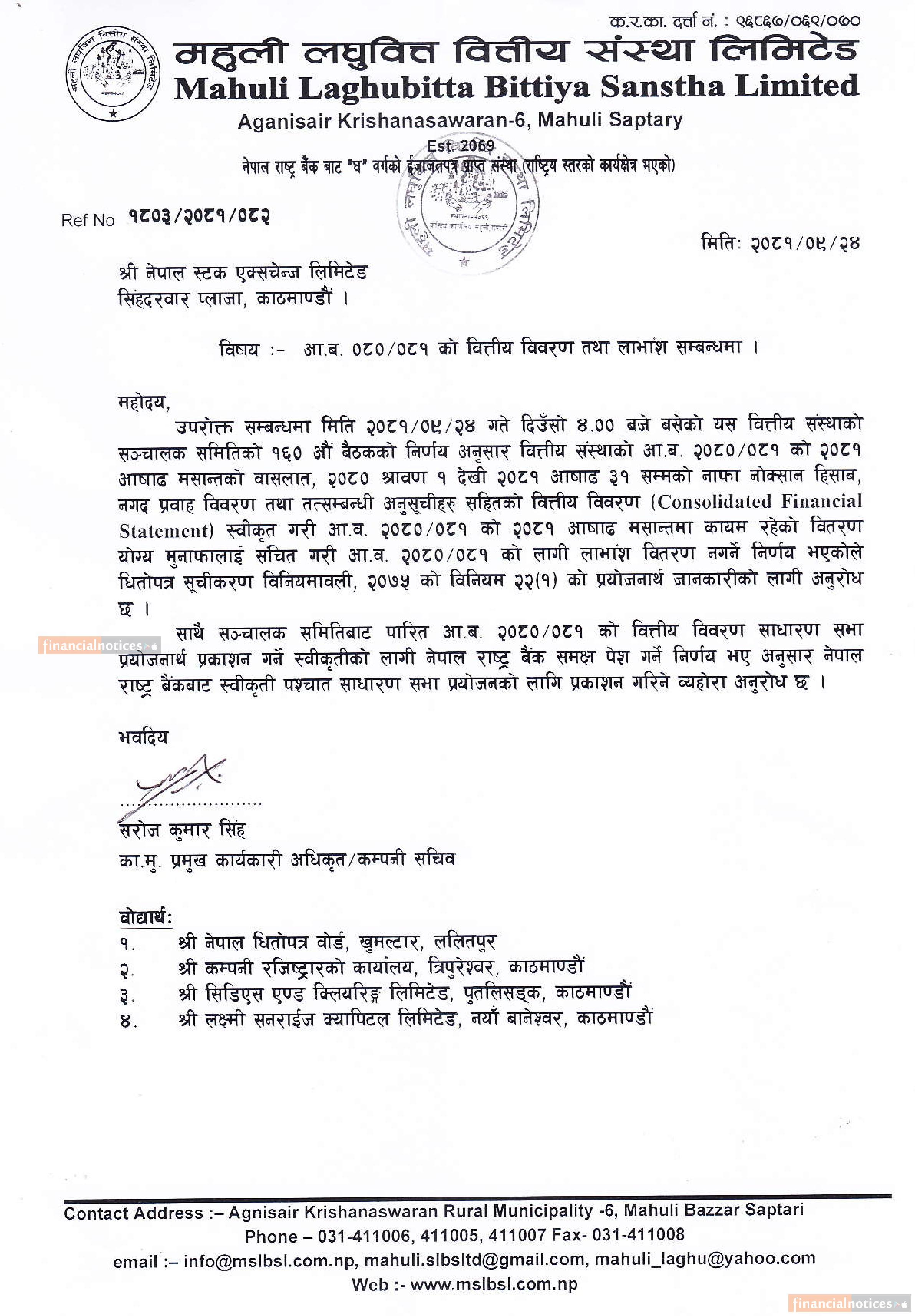 महुली लघुवित्तले लाभांश वितरण नगर्ने सम्बन्धी सूचना