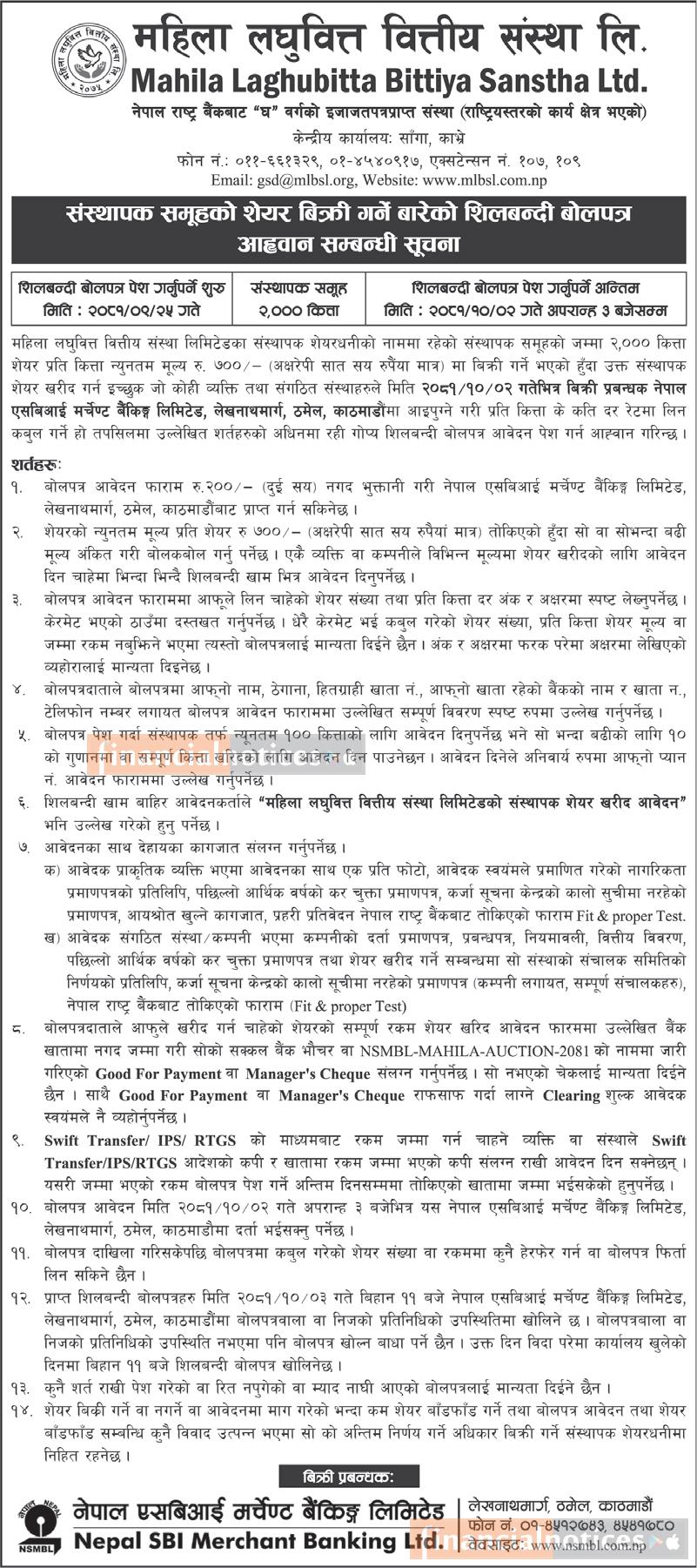 महिला लघुवित्तको २००० कित्ता संस्थापक शेयर बिक्री गर्ने सम्बन्धी सूचना