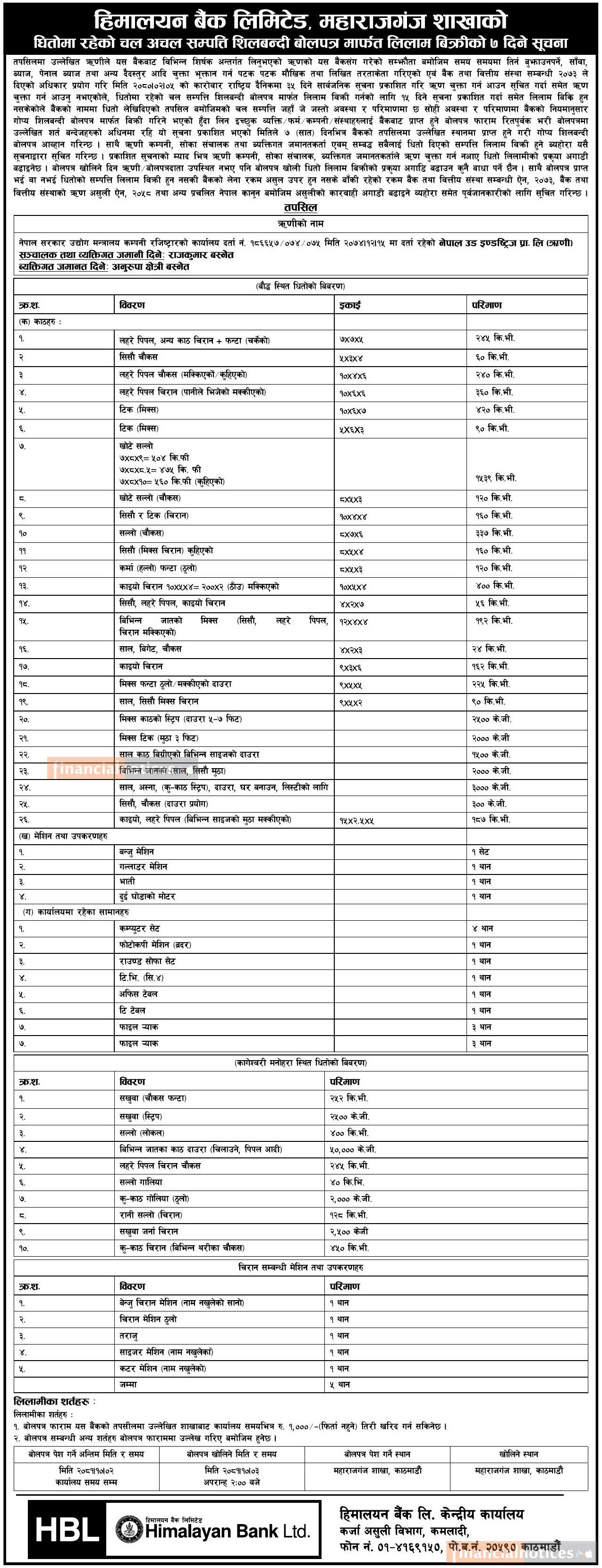हिमालयन बैंक महाराजगंज शाखाको धितोमा रहेको चलअचल सम्पत्ति लिलाम बिक्रीको सूचना