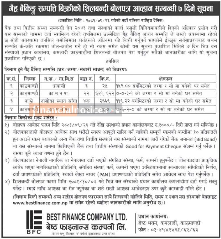 गैह्र बैंकिङ्ग सम्पत्ति बिक्रीको शिलबन्दी बोलपत्र आव्हान सम्बन्धी ७ दिने सूचना