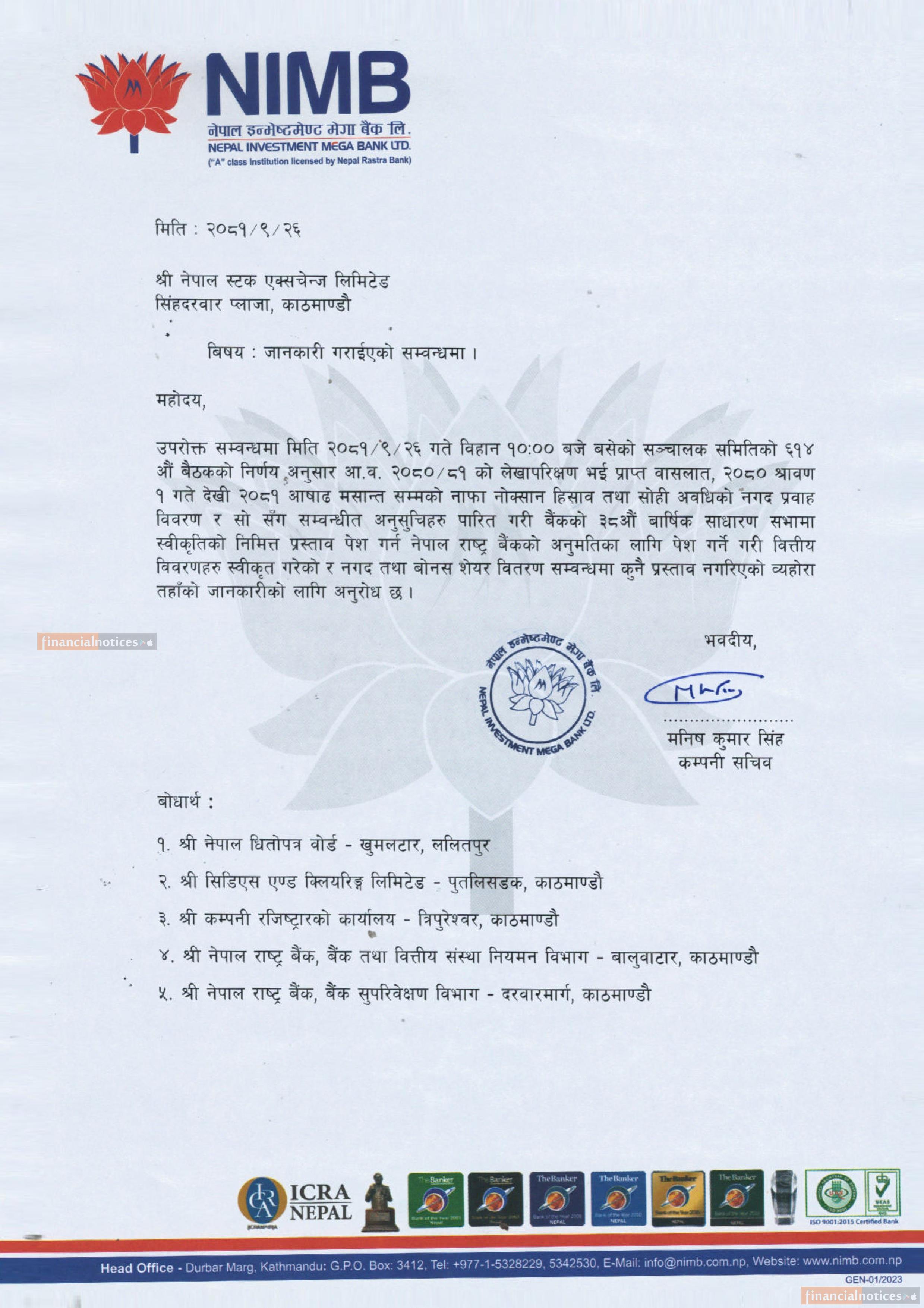 नेपाल इन्भेष्टमेण्ट मेगा बैंकले लाभांश वितरण नगर्ने सम्बन्धी सूचना