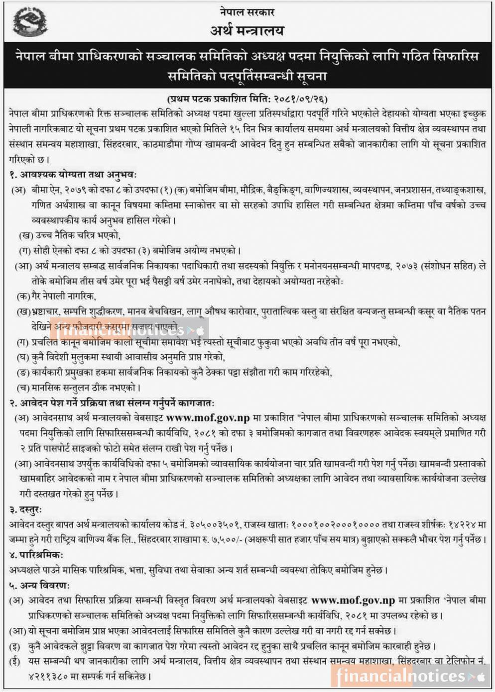 नेपाल बिमा प्राधिकरणमा अध्यक्षको आवेदन खुल्ला सम्बन्धी सूचना