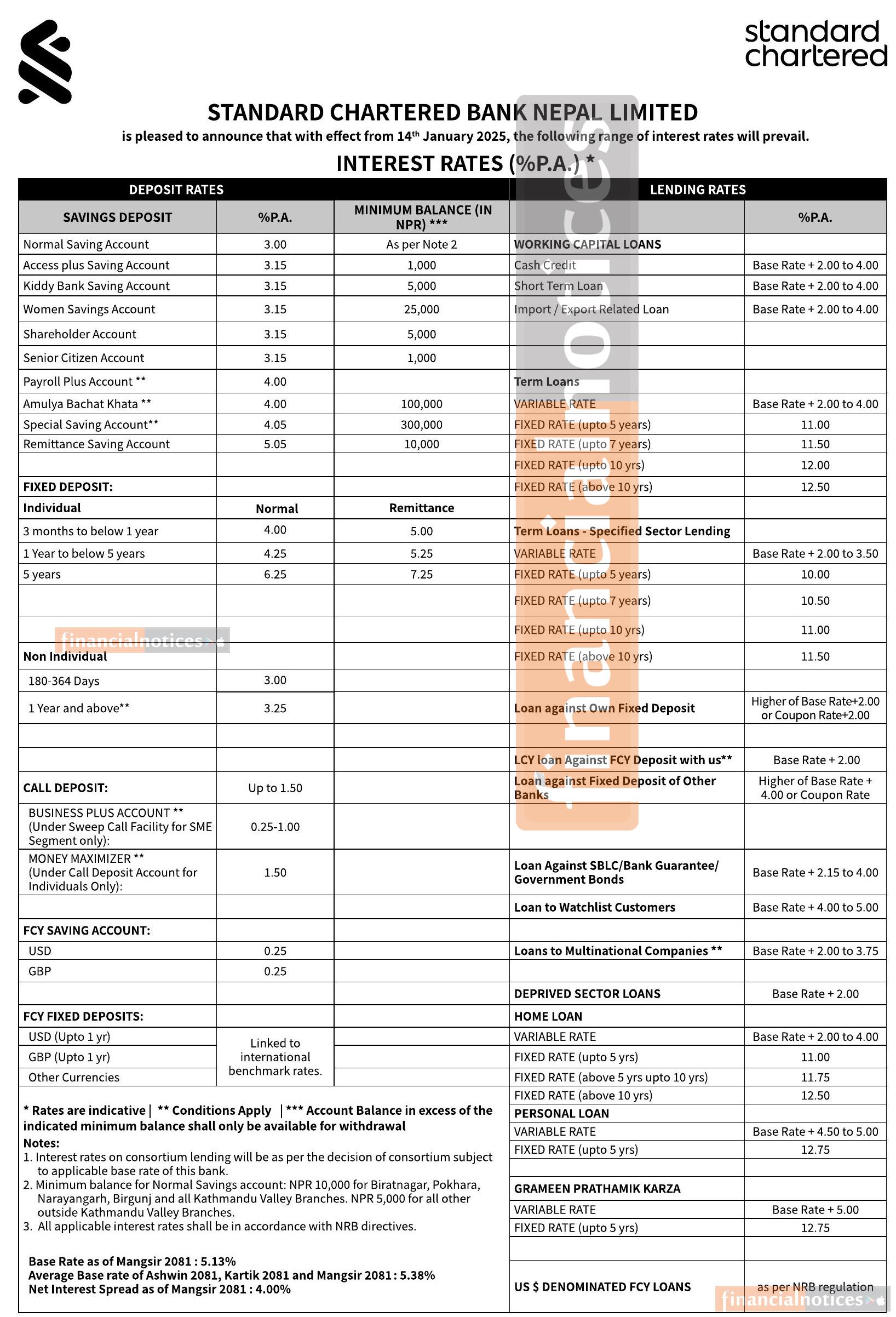 स्ट्यान्डर्ड चार्टर्ड बैंकको माघदेखि लागू नयाँ ब्याजदरको सूचना - New Interest Rates -