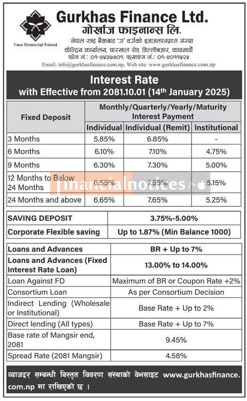 गोर्खाज फाइनान्सको नयाँ ब्याजदर सार्वजनिक सम्बन्धी सूचना