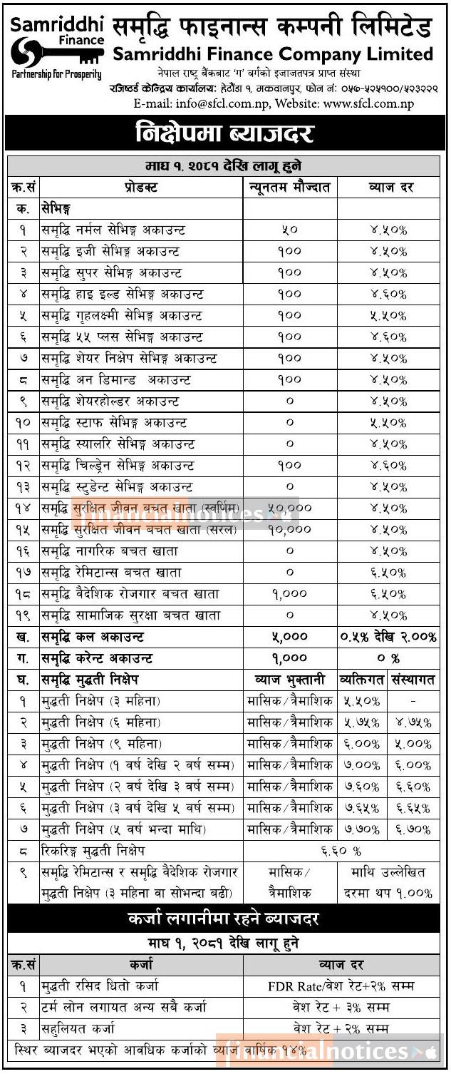 समृद्धि फाइनान्सको माघ महिनाको लागि ब्याजदर परिवर्तन सम्बन्धी सूचना - Interest Rates -