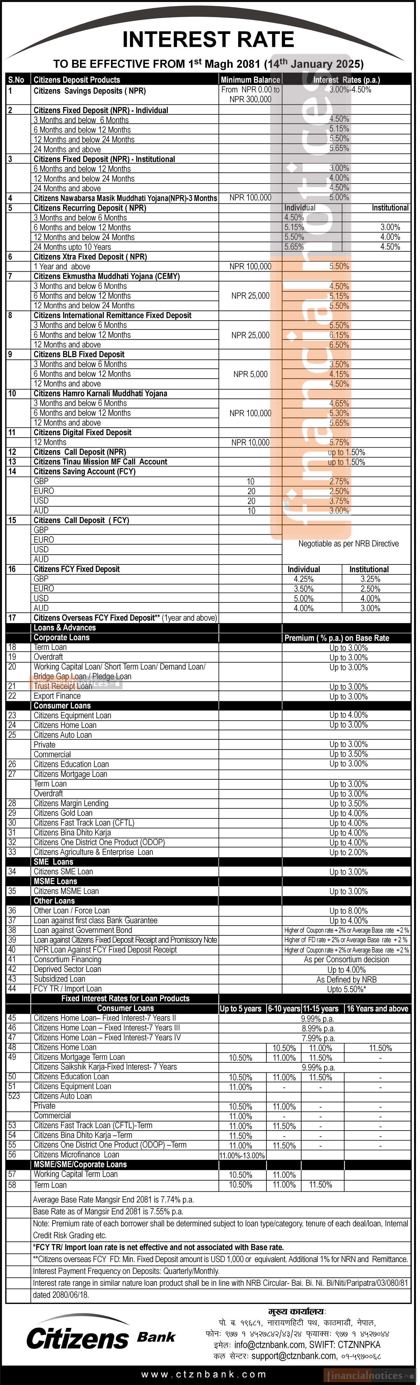 माघ महिनाका लागि सिटिजन्स बैंकको नयाँ ब्याजदर सार्वजनिक, जानौ कुन खातामा कति ?