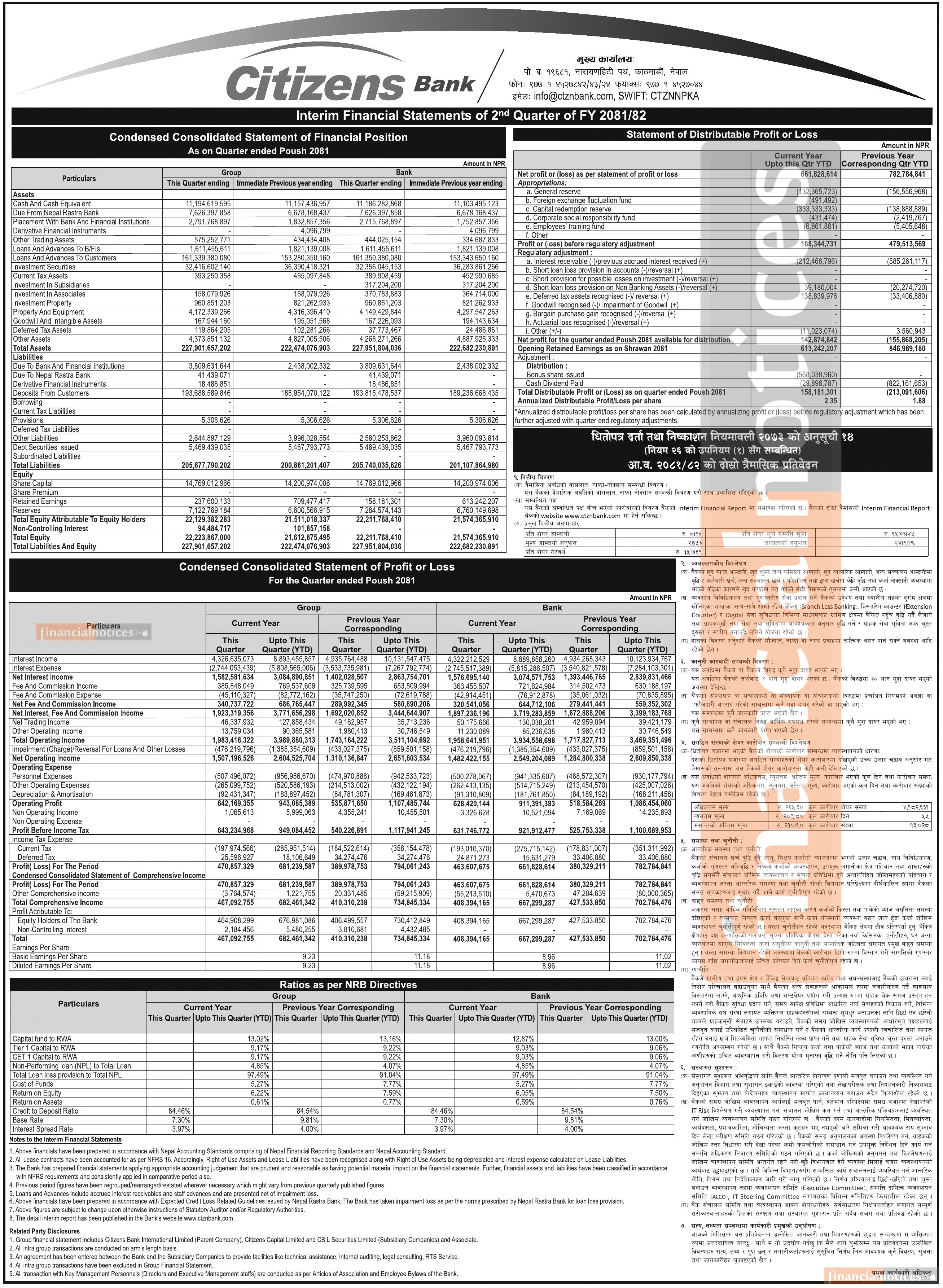 सिटिजन्स बैंक इन्टरनेसनलको दोस्रो त्रैमाससम्ममा खुद नाफा ६६ करोड १८ लाख रुपैयाँ
