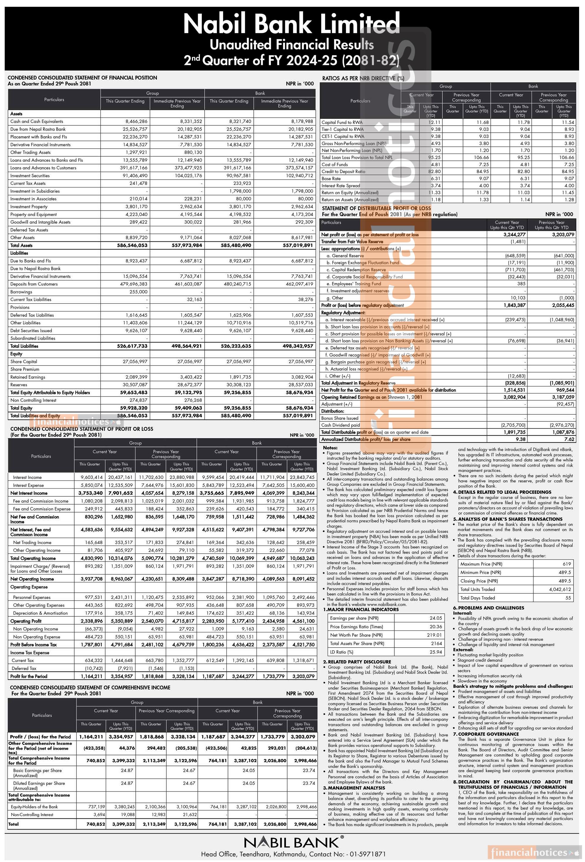 चालु आर्थिक वर्षको दोस्रो त्रैमाससम्म नबिल बैंकको खुद नाफा १.२९% ले वृद्धि भएर ३ अर्ब २४ करोड ४२ लाख रुपैयाँ पुगेको छ, जबकि अघिल्लो वर्ष यस अवधिमा ३ अर्ब २० करोड रुपैयाँ नाफा थियो।